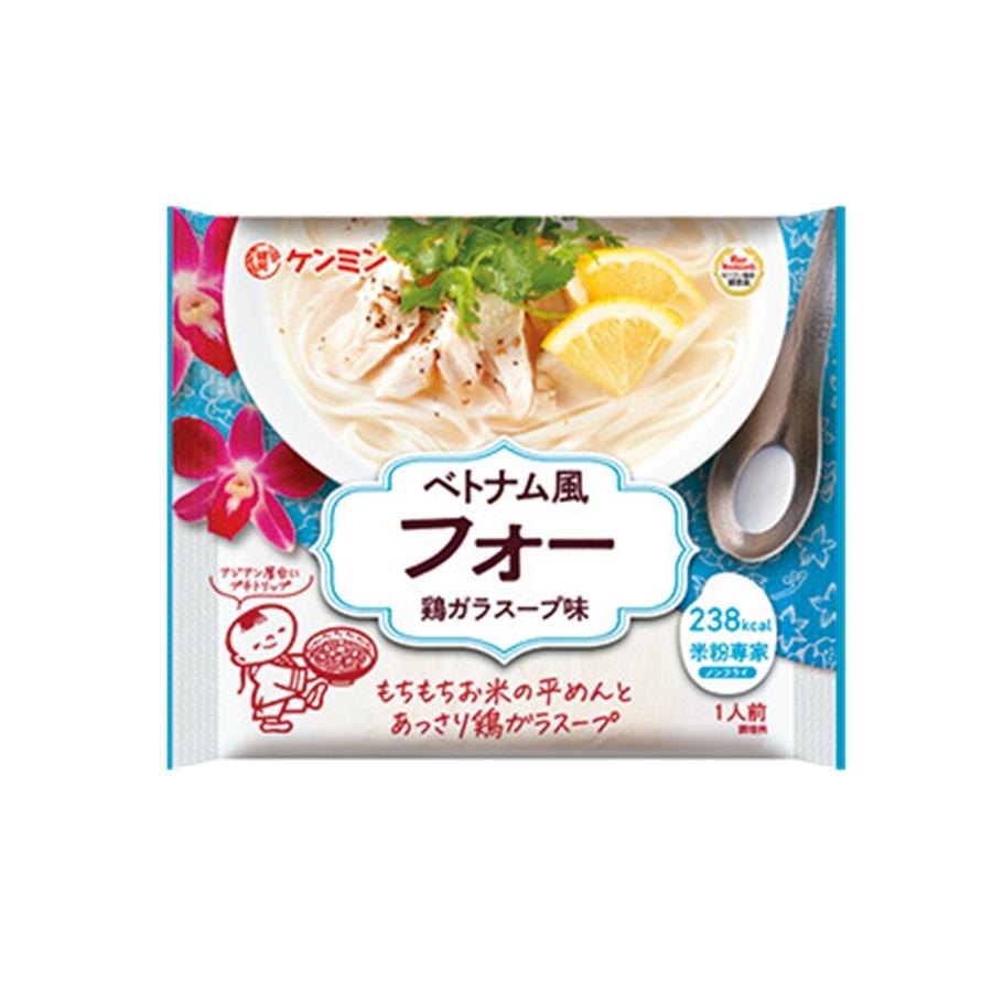 もちもちした食感がクセになりそうなお米の平麺。魚醤とコリアンダーの優しい香りがアクセントになった、あっさり鶏ガラスープ味。5袋 ¥800(ケンミン食品 TEL. 078-366-3035)