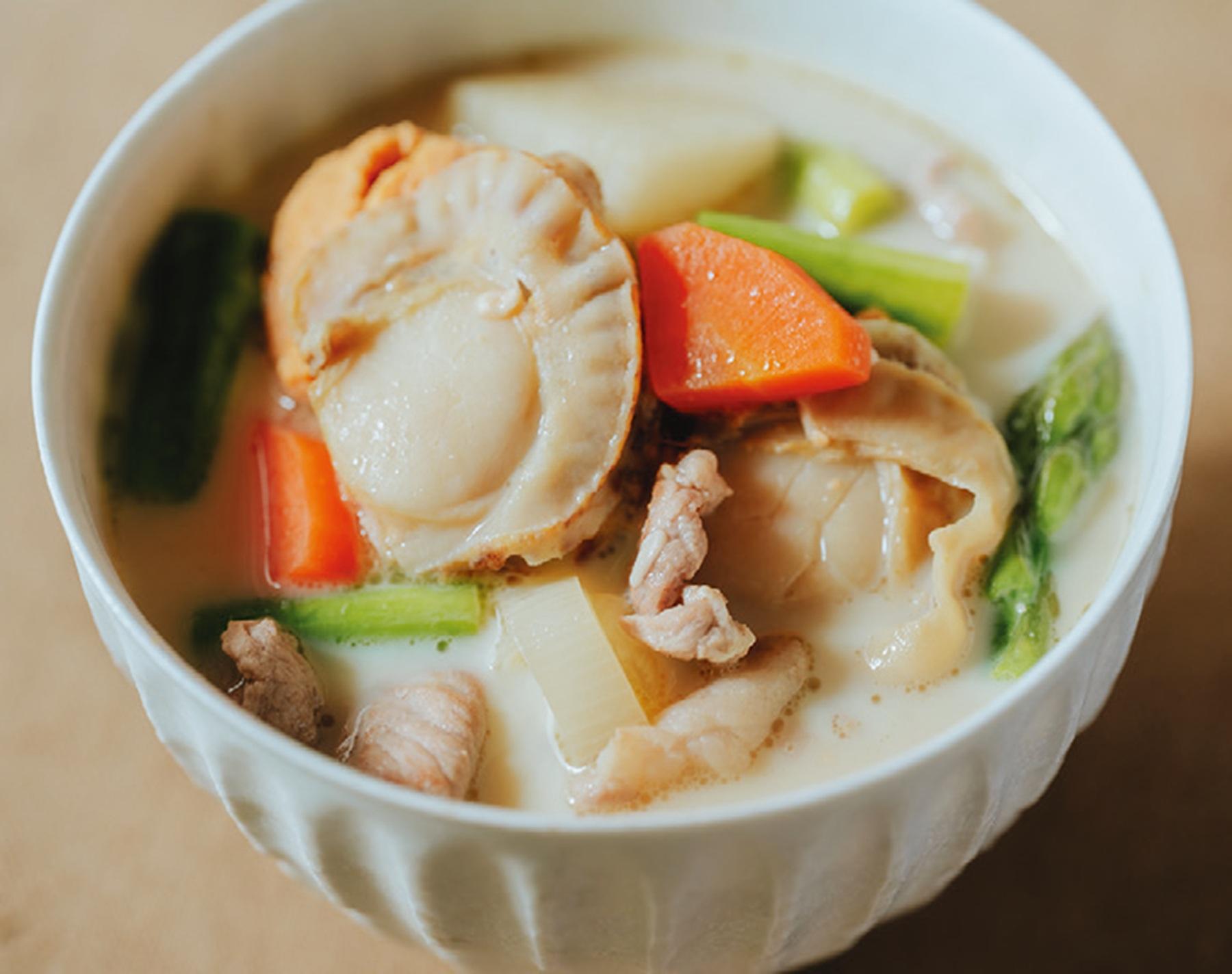 クラムチャウダー風にすれば、さらにまろやかな味わいになり、コクもアップ。「豆乳には『水』を満たす潤い作用があります。大豆イソフラボンがストレスホルモンを作る酵素の働きを防いでくれます」。豆乳の代わりに牛乳でもOK。