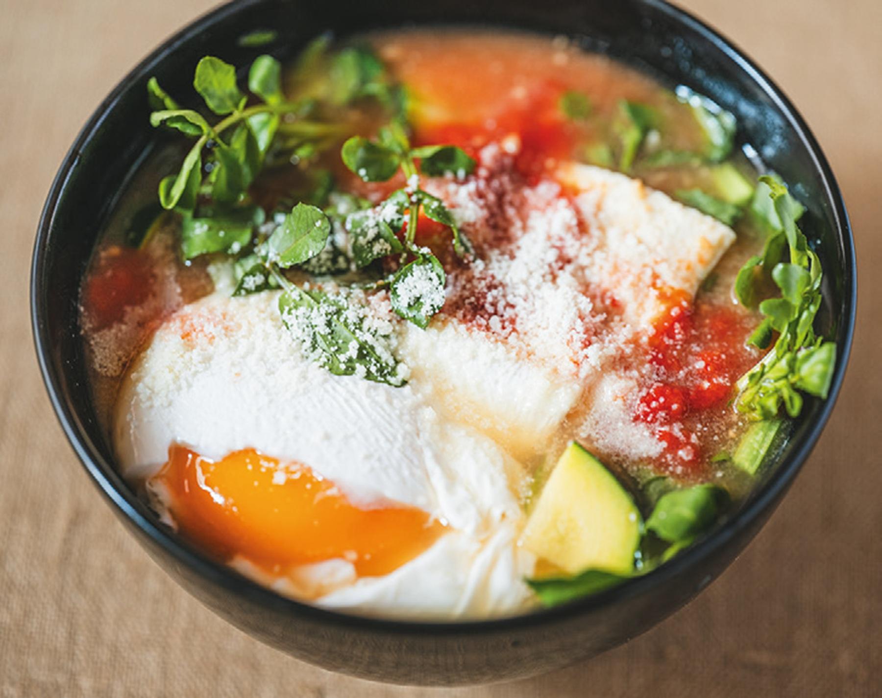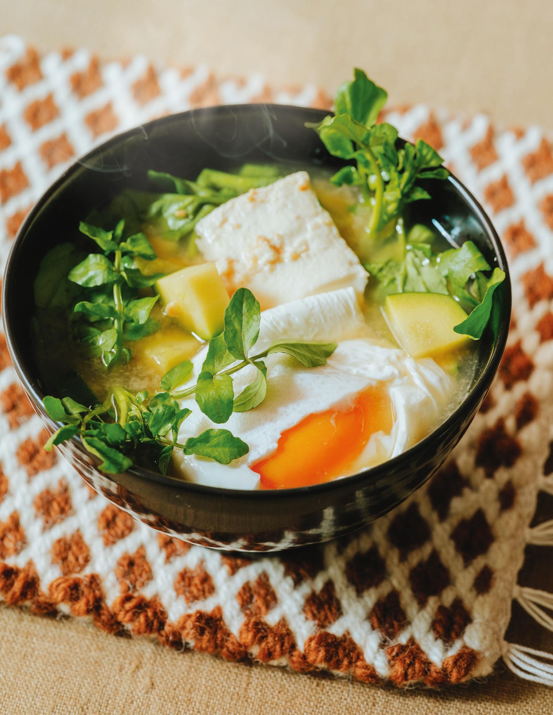「豆腐は、豆乳同様に潤い作用が高く、ズッキーニなどのウリ類は『水』を調節してくれる働きがあり、体内の水分を循環させてくれます。水辺に育つクレソンも『水』の流れを整えながら熱を冷まして潤いを生んでくれます。卵は、『気』を補って疲れを和らげたり、心身の緊張を解く作用が」。卵の黄身がとろ~りと流れて、食卓映え間違いなし。卵はみそ汁の中に直接落としても、ポーチドエッグにしてのせてもOK。