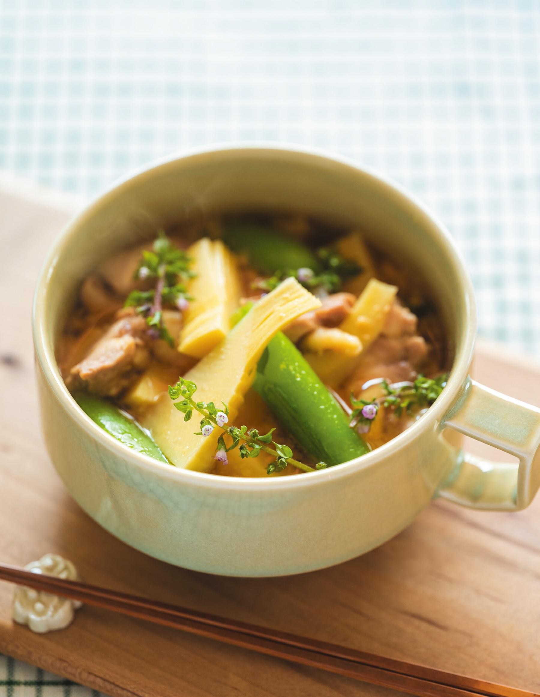 「タケノコに合わせるのは、同じ時期に旬を迎えるみずみずしいスナップエンドウ。さらに消化を促進してくれる鶏肉や、食物繊維が豊富なエリンギもおすすめ。整腸作用があるしその花『穂じそ』といったしそ系や、胃腸の働きを活発にする木の芽(山椒の若芽)を添えれば、香りが広がり食欲をそそります」
