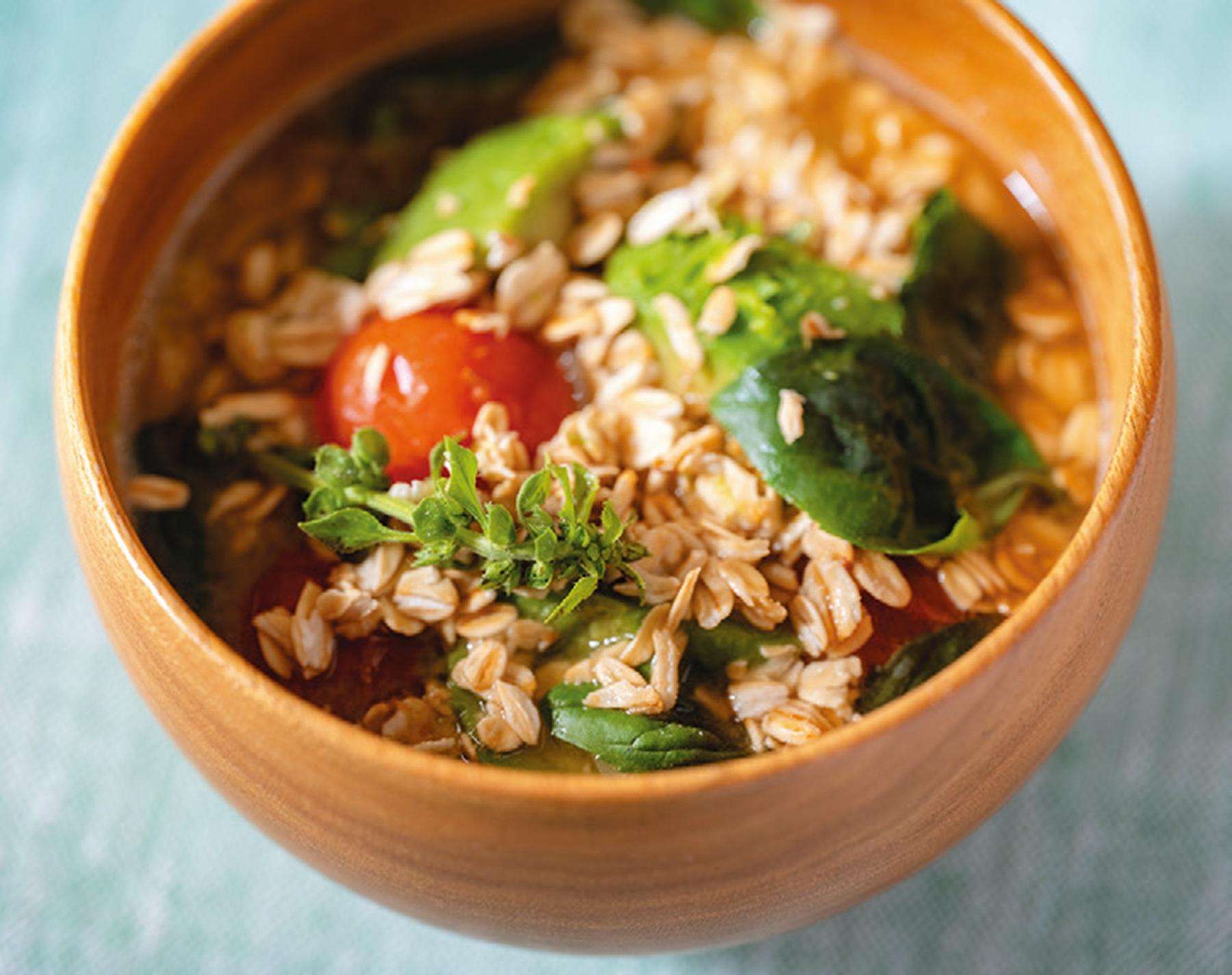燕麦を脱穀して調理しやすく加工したオートミールをプラスしてリゾット風に。噛み応えがアップして満足感のある一杯に。「オートミールは不溶性食物繊維が豊富なため腸を動かしてくれます。モチモチとした食感もたまりません!」