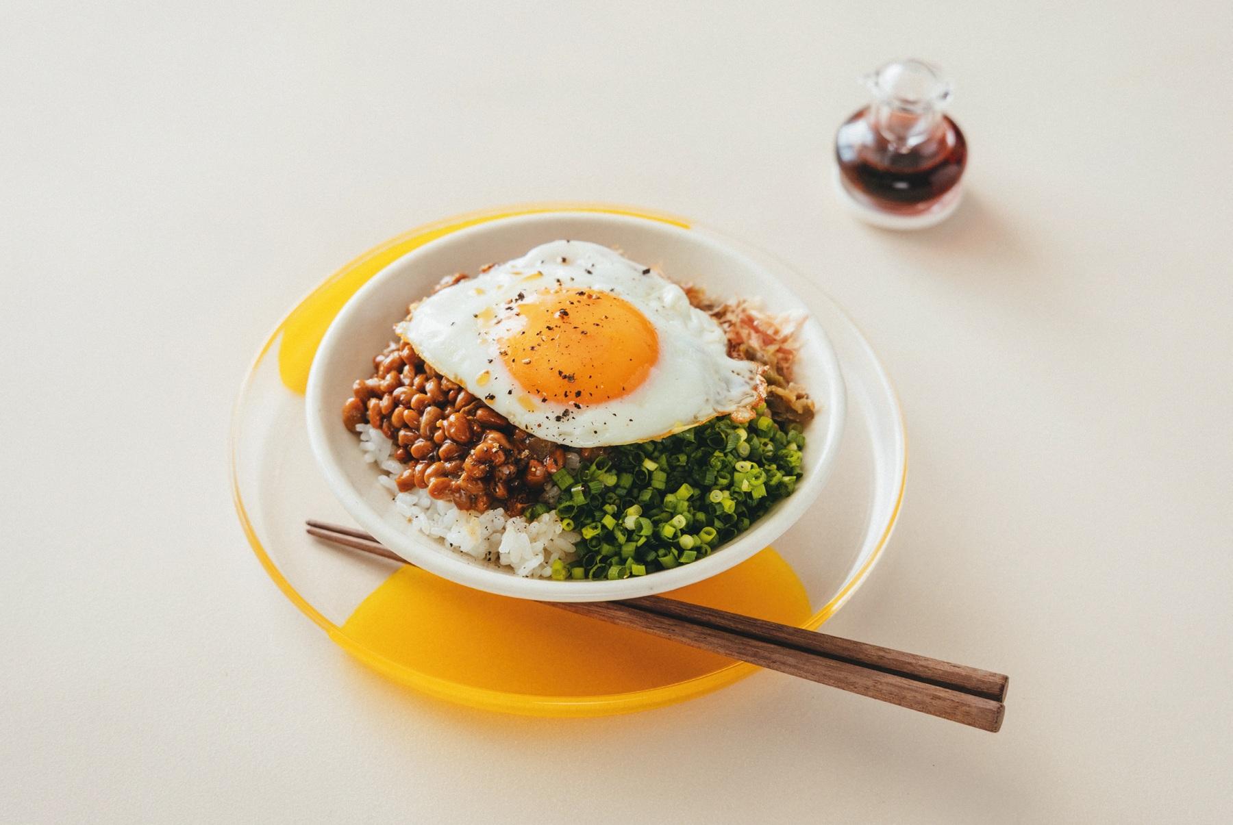 ③ 器にご飯適量を盛り②の納豆をのせ、削り節適量をかけ、刻んだ小ねぎとザーサイ(瓶詰めなど)を適量のせる。最後に①の目玉焼きをのせ黒酢適量を回しかけ、黒こしょうをひく。