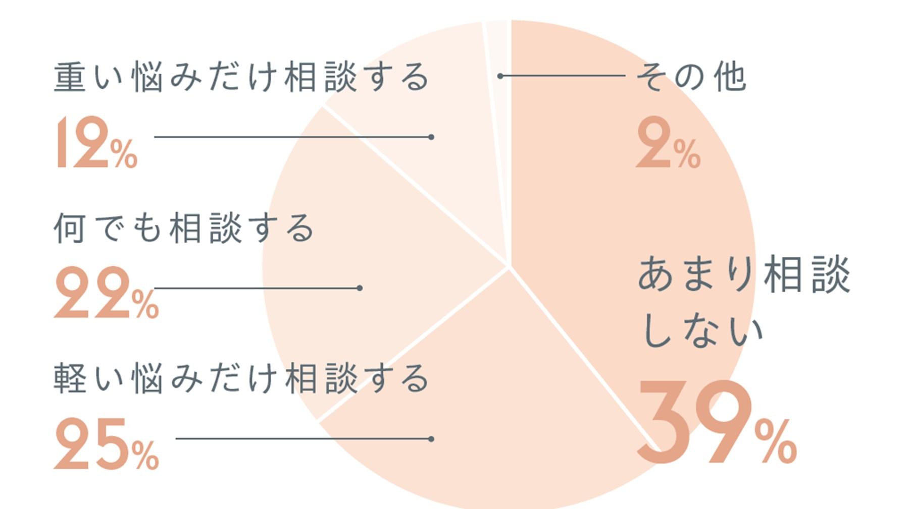 「あまり相談しない」約40%、続いて「軽い悩みだけ」25%と少しドライな関係性を感じる結果に。