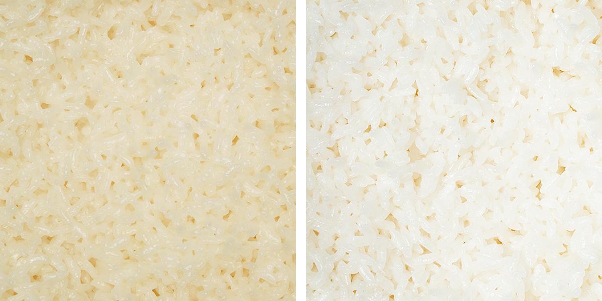 左は東芝従来機種RC-10HWで通常保温、右はRC-10SGXで真空保温したごはん。真空保温なら空気を抜いて保温するので、水分を保って色ツヤ長持ち。※3合炊飯時、24時間後の比較。比較のためほぐさず試験。炊飯量・室温・電圧・蓋開閉回数などにより保温状態は変わります。