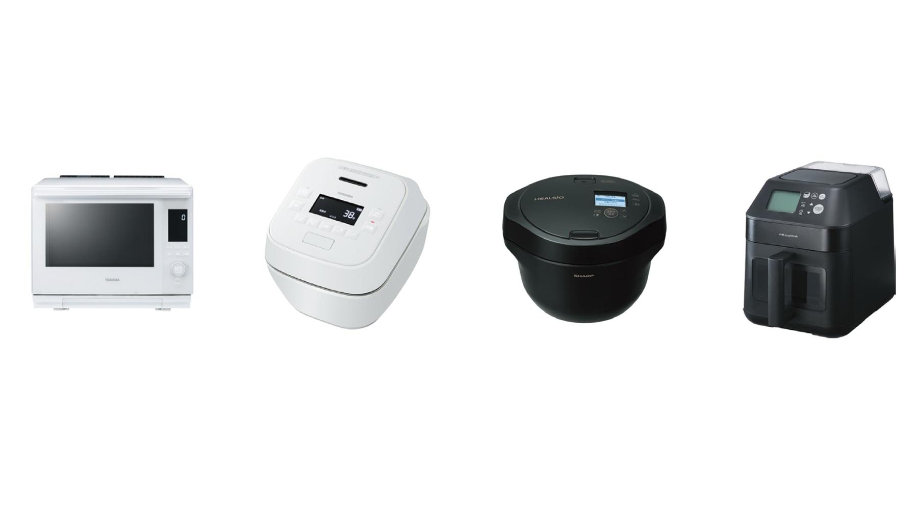 左から、TOSHIBAの石窯ドーム(R)ER‐D3000B、炎匠炊き(R)RC‐10SGX、SHARPのヘルシオ ホットクック KN‐HW24H、レコルトのハイスチームエアーオーブン