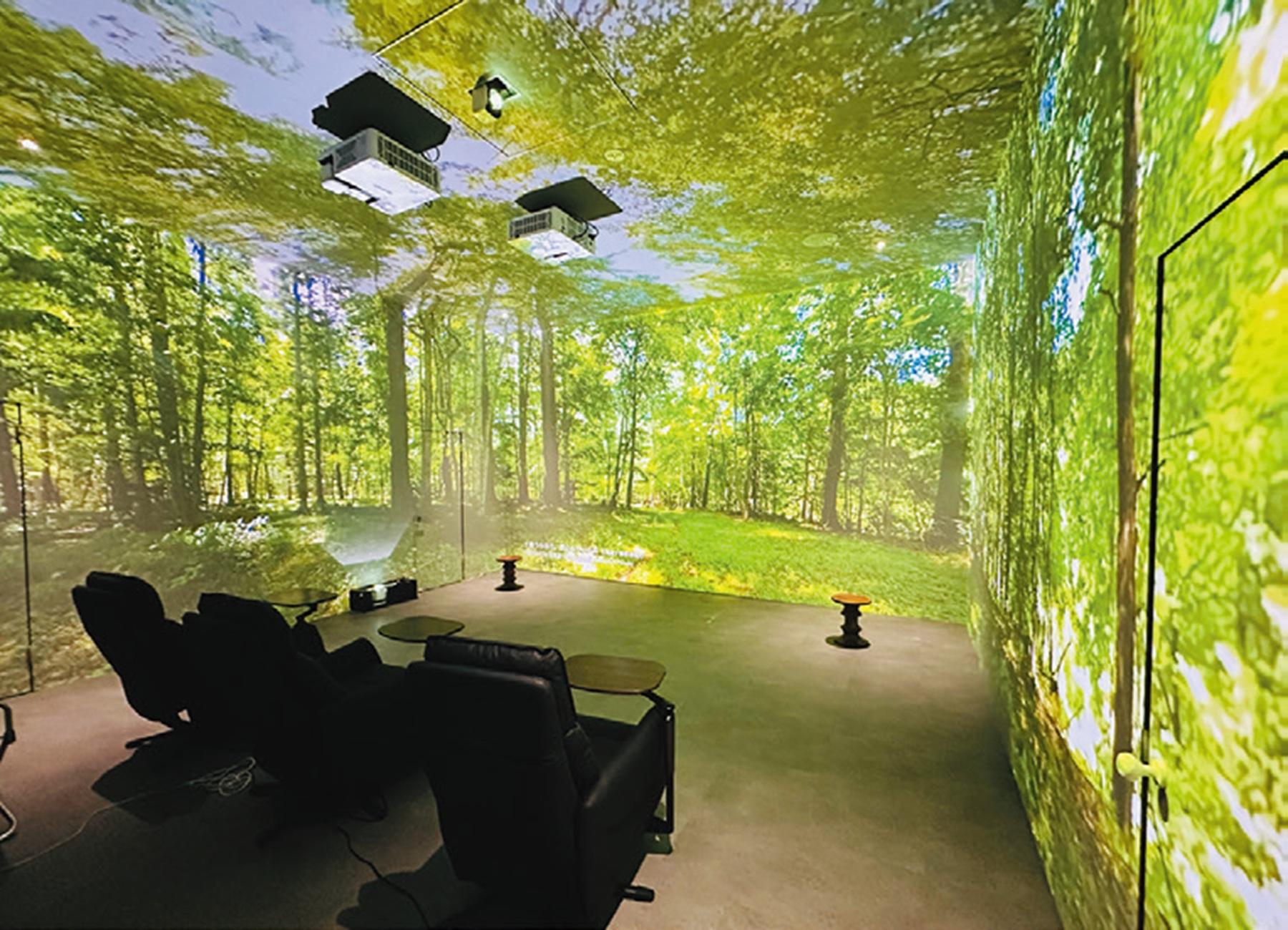 街中にいながら日本各地の自然空間にいるような体験ができる「デジタル森林浴 uralaa」。そのスポットの一つが、日本科学未来館の特別企画「ツカレからの脱出~疲れとやすみのサイエンス」(7月16日~9月15日)。大型スクリーンや音響に包まれ、実際の森林浴に近いリラックス効果が。
