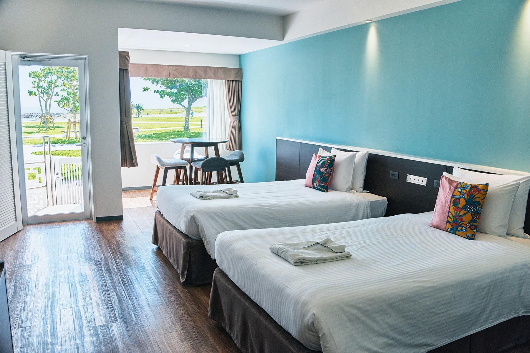 「ビーチサイドルーム」は全5部屋。外には手入れされたばかりの芝の風景が。沖縄伝統の染色技法・紅型(びんがた)のクッションも美しい。