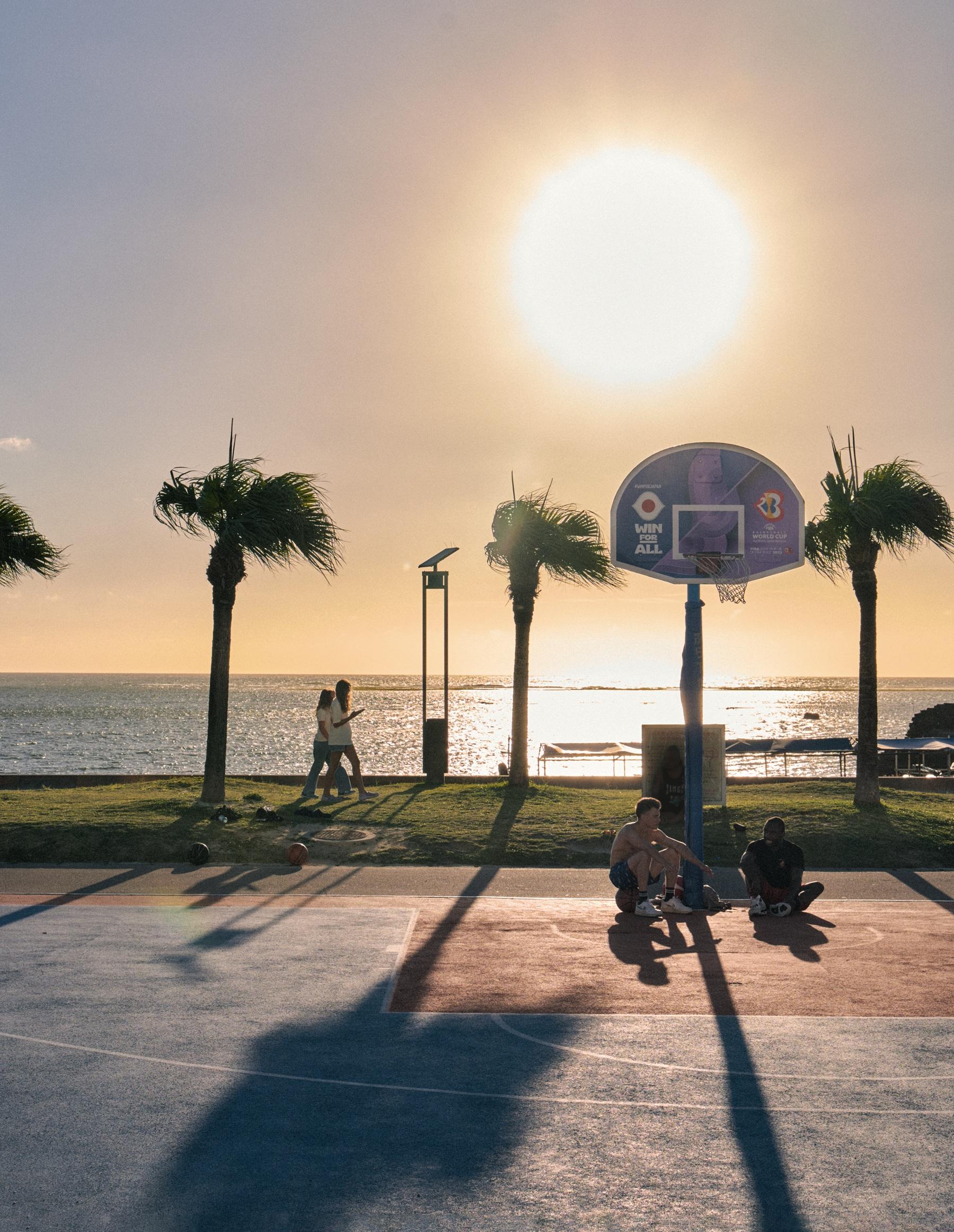 北谷町最南端、全長約600mのロングビーチは、遊具で遊んだり、ピクニックでくつろいだり、ファミリーやペット連れなどが自由に行き交う。バスケットコートの賑わいには昨今の沖縄バスケ熱を感じさせる。