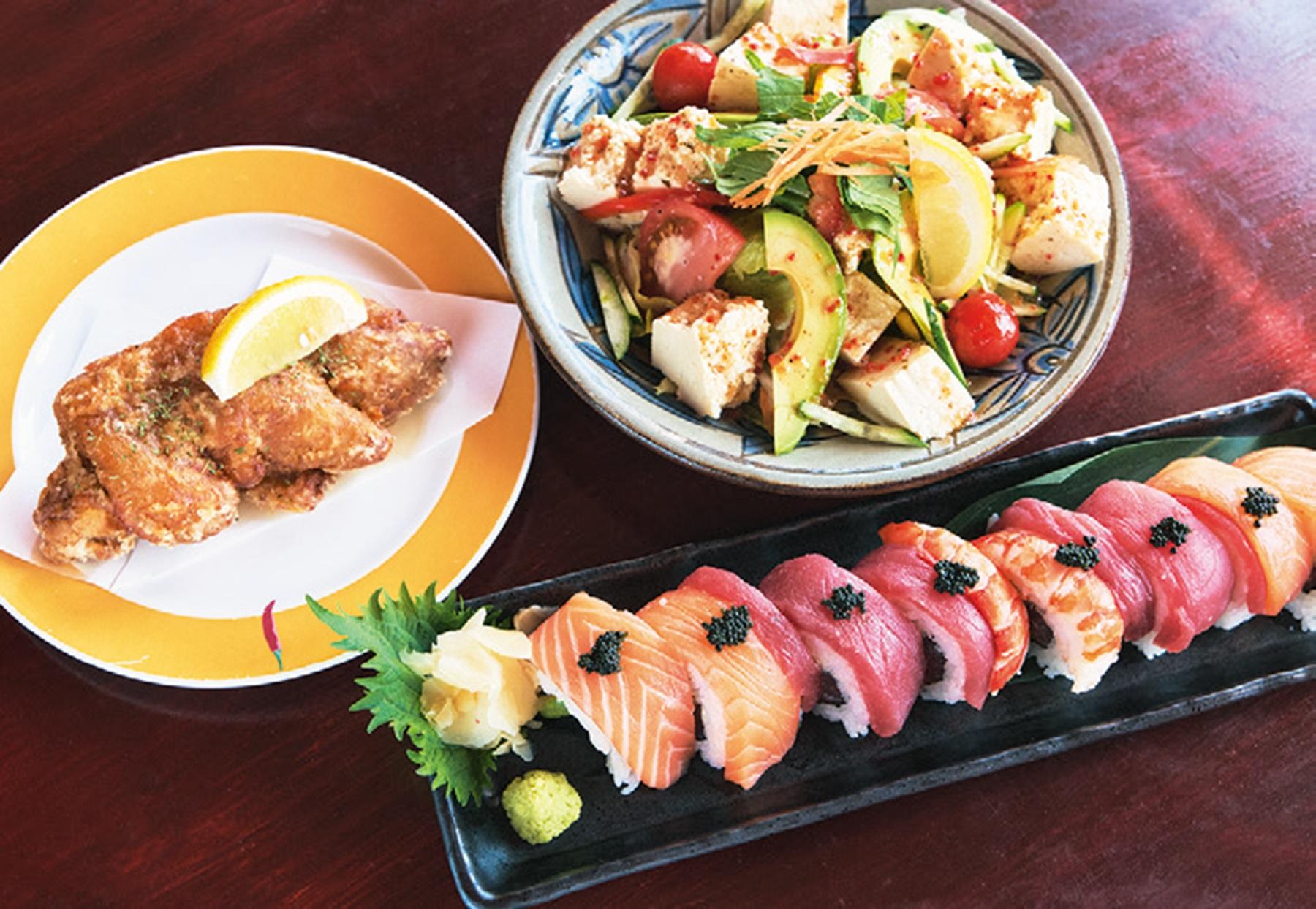 「ビーチキッチン」の人気メニュー。右上から時計回りに、「島豆腐サラダ」¥780 「美浜ロール」¥1,500 「てびち(塩レモン)」¥550