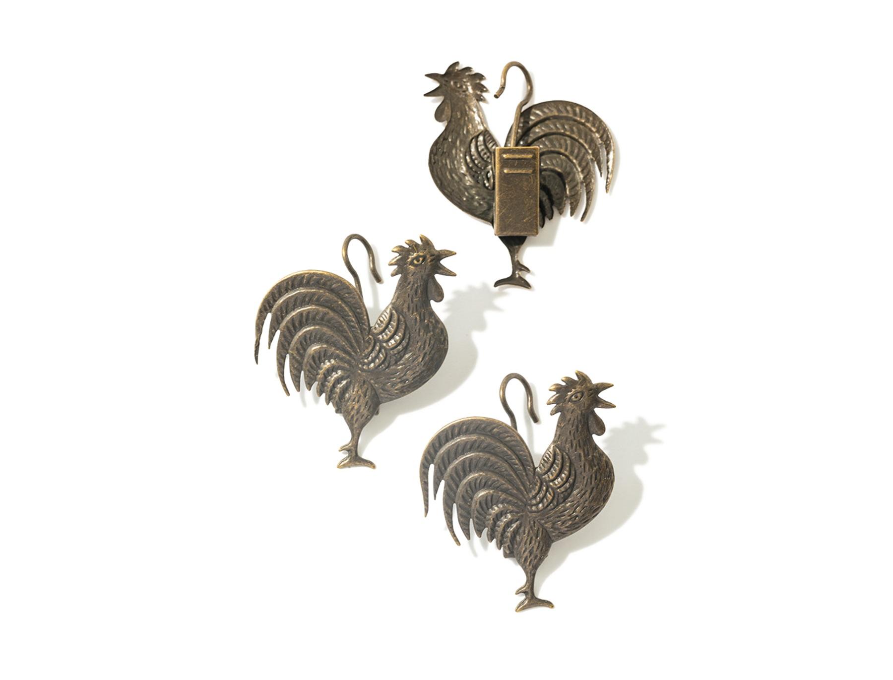 レールに取り付けて布を固定するカーテンクリップ。細かい部分まで丁寧な型押しで表現されたヴィンテージ調のニワトリモチーフが、シンプルな部屋のさりげないアクセントに。