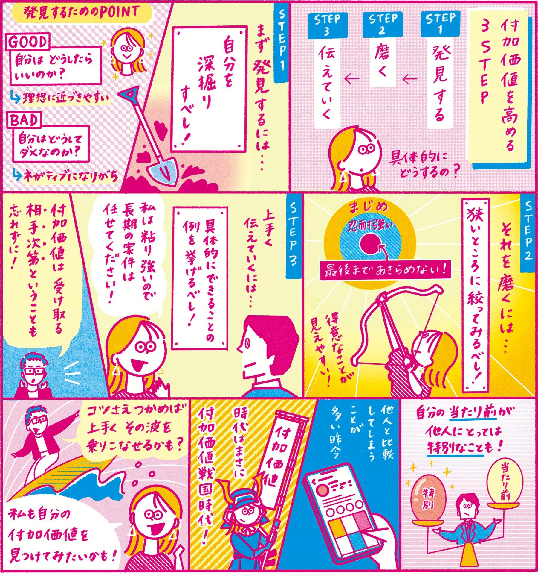 「大切なのは、付加価値のアウトプットの仕方。また、付加価値は新しい何かを身につけるだけでなく、もともと自分の持っているものから育てることも考えるといいです。視点を変えれば、誰しもそのタネが見つけられるでしょう」
