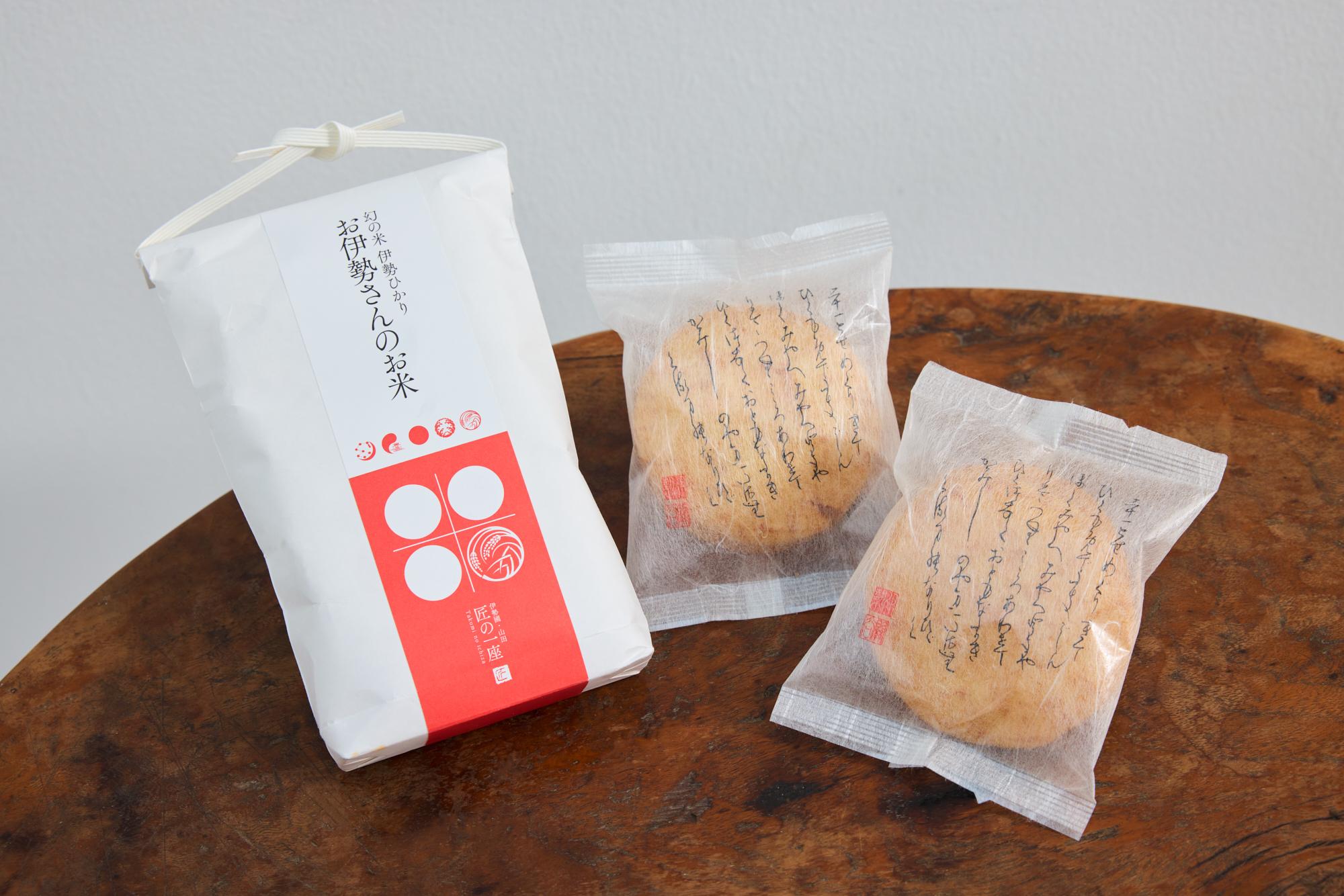 左・「匠の穂 お伊勢さんのお米」300g ¥648 右・「イセヒカリ」で作ったおせんべい「お伊勢さんのおせんべい お木曳の唄 」2枚×8袋 ¥972