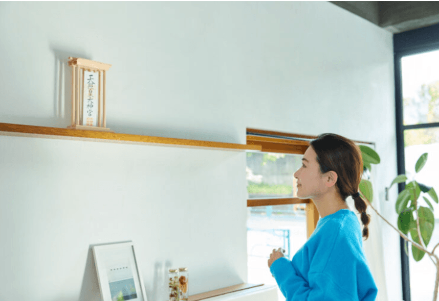 神棚は、南向きあるいは東向きで、目線より高く、清浄な場所におまつりし、お米や塩、水などをお供えするのが習わしですが、こだわりすぎず、自分のできる形でおまつりしましょう。何よりも尊ぶ心を持って日々丁重にお参りすることが大切です。