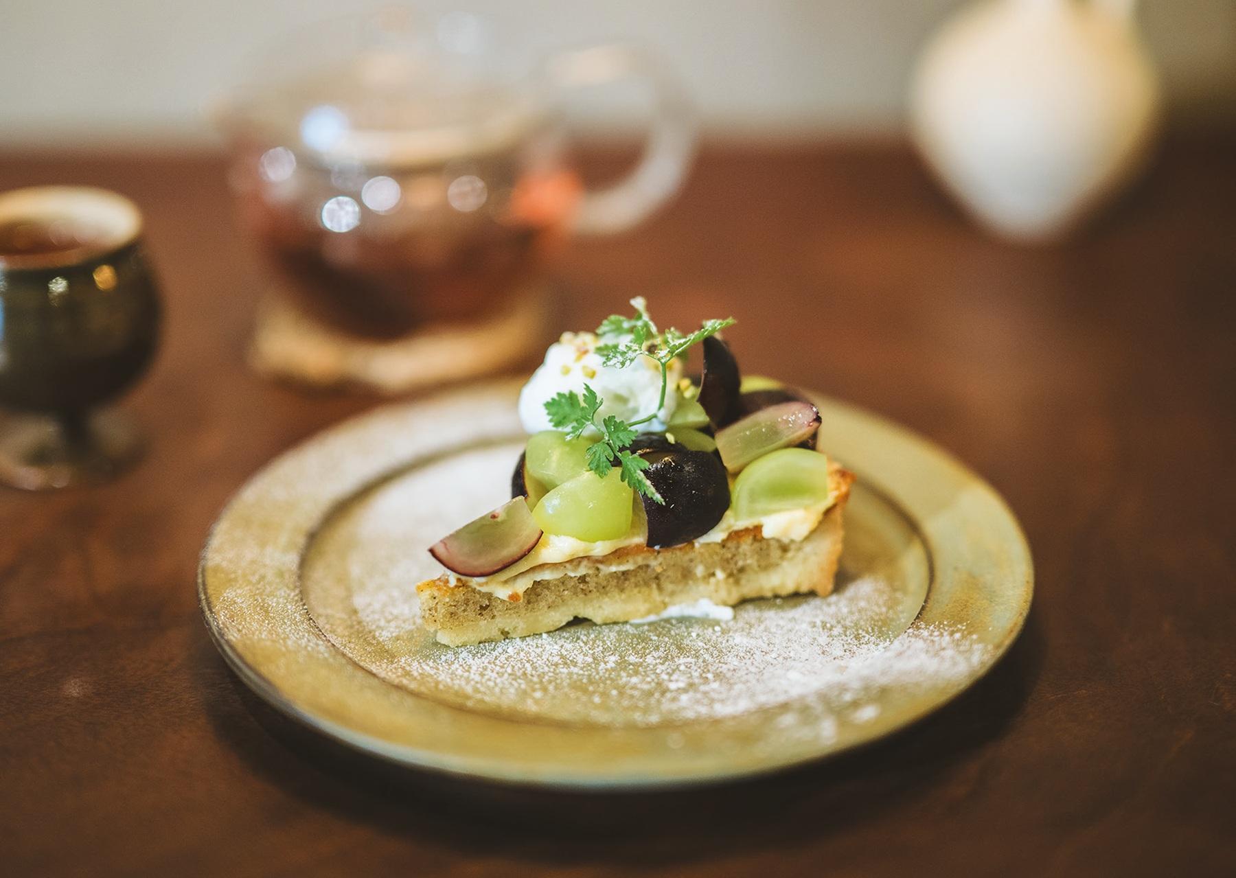 諏訪の末広商店街の一角。かつて薬局だった築100年の建物をリノベーションし、村上信之さん・智美さん夫妻が店を切り盛りする。手前に雑貨の販売スペース、奥にカフェスペースを配置。店内の薬棚やガラス戸は薬局時代のもので、当時の面影が残る。そんなノスタルジックな気分に浸れる空間で味わいたいのは、旬のフルーツを使った手作りスイーツ。「2種の葡萄のタルト」は今だけのお楽しみで、しっかりとしたタルト生地に、クレームダマンド、カスタードクリームをのせ、信州産のシャインマスカットとナガノパープルを贅沢にあしらった一皿。