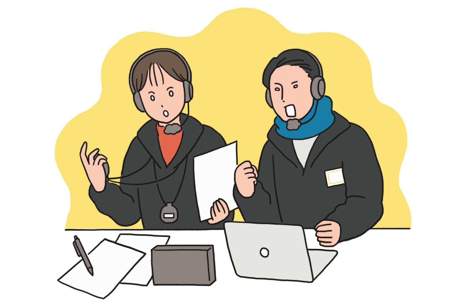 センターのサブアナは、本番の業務以外に事務的な仕事も多いです。⼤学20校と関東学⽣連合にアンケートを送り、記⼊していただいた全選⼿のアンケートを取りまとめるような業務も⾏っています。その後は各⼤学の担当アナと連携をとって選⼿への取材を⾏っています。