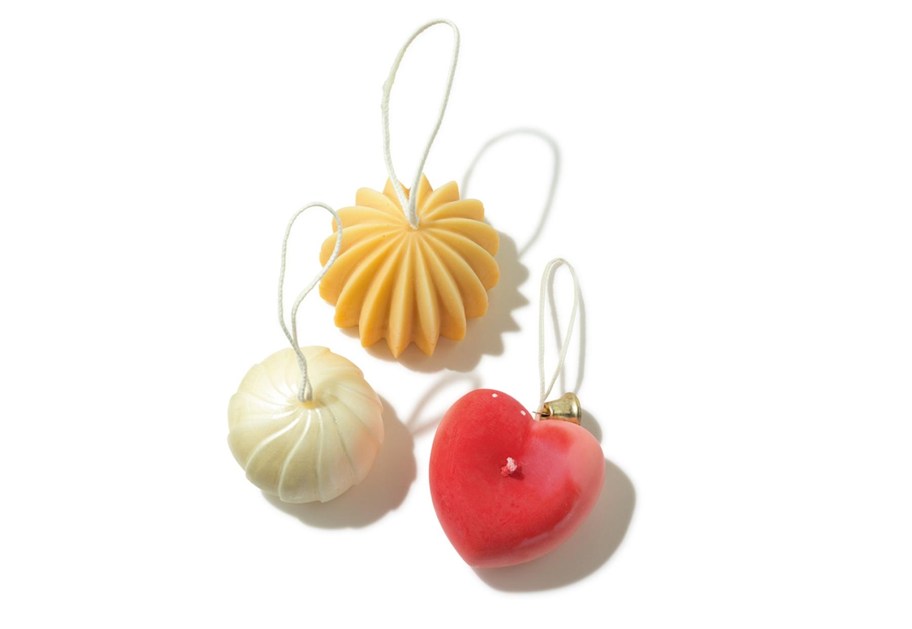 オーナメントとして飾れるキャンドルセット。心地よい香りが空間全体にほんのりと広がる。上から時計回りに、φ7×H4.5cm、φ6.5×H3cm、φ6×H4.5cm ¥5,940(honey flamingo/ジェネラルファニシングスアンドコー TEL. 03-6432-9910)