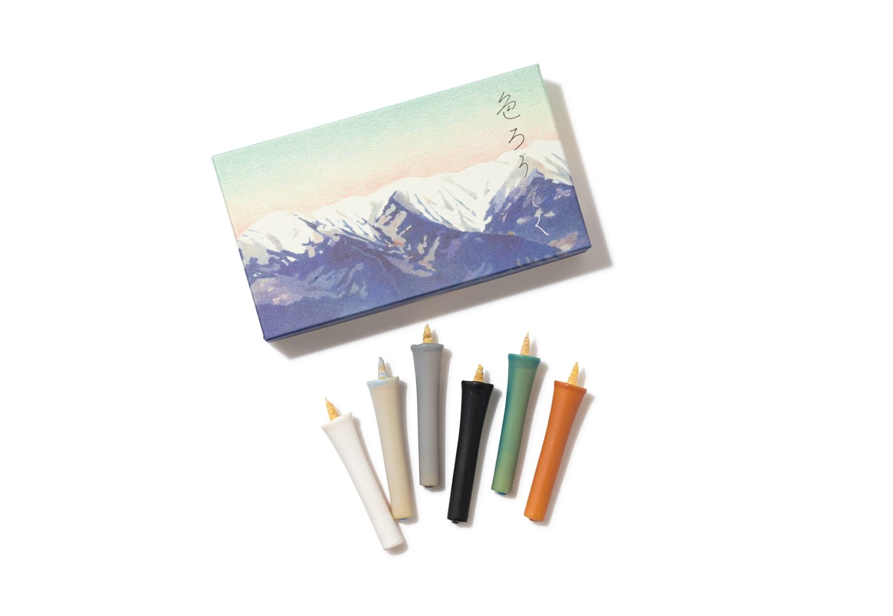 手作りならではの温かみのある和ろうそく。春夏秋冬シリーズの「冬」は、「氷の下」や「こたつの定番」「しんしん」など、この季節にちなんだイメージで作られた6本がセットに。色ろうそく 冬¥1,430(和ろうそく大與 TEL. 0740-22-0557)