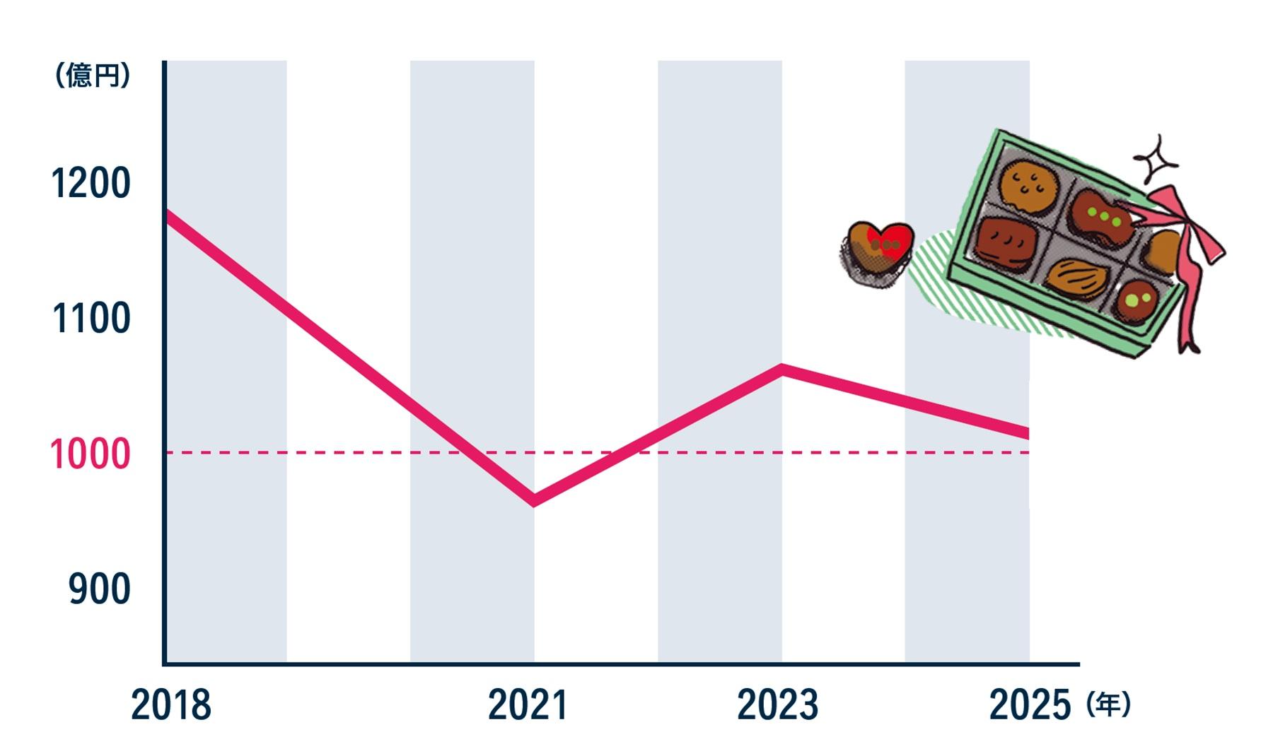 経済効果減少の要因はコロナ以外にも!? 2021年に約972億1296万円まで落ち込むも、ここ最近は約1000億円前後で推移。減少の原因は、義理チョコ文化の縮小やカカオ価格の高騰による単価上昇、ギフトの多様化などが考えられる。ただ、それでも高水準を維持しているのは、根付いた文化であり、“自分へのご褒美”需要の高まりなども要因。