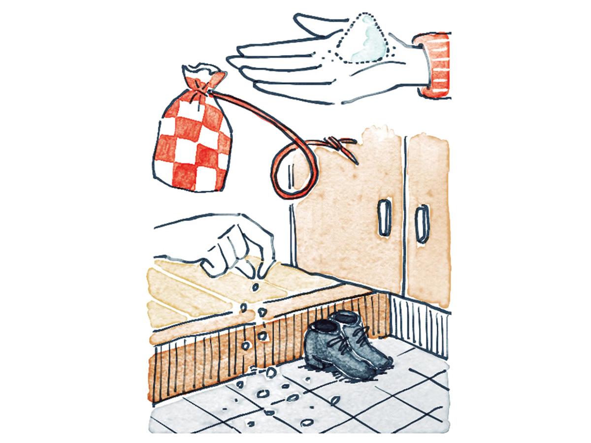 玄関のたたきに塩をひとつまみまき、箒で掃いてちりやほこりも取り除こう。「掃除機ではなく箒を使うことで邪気払いの力がアップ。清潔な玄関は福を呼び込む入り口に」
