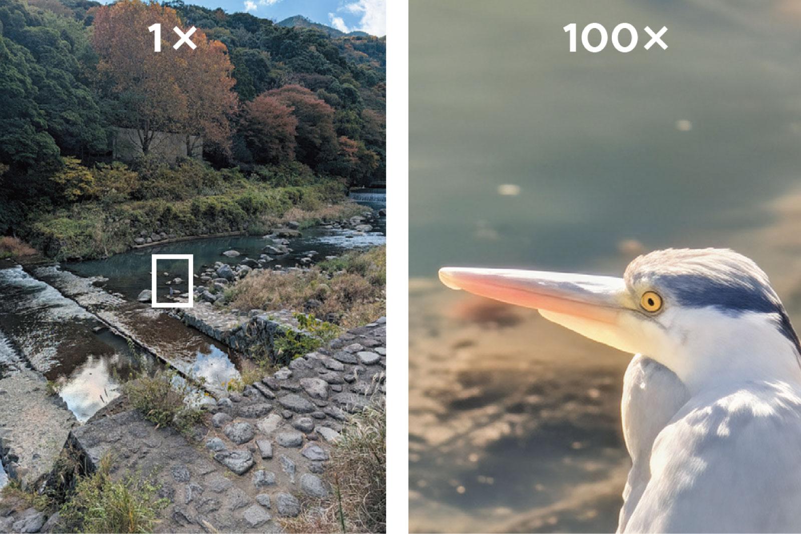 最大100倍の超解像ズーム Proを使い、旅の途中で見つけたアオサギを撮影。Google Pixel 10 Proのアップグレードされた望遠レンズとAI補正技術により、遠くの景色もこれまでにないくらいメリハリのあるくっきりとした写真になるんです
