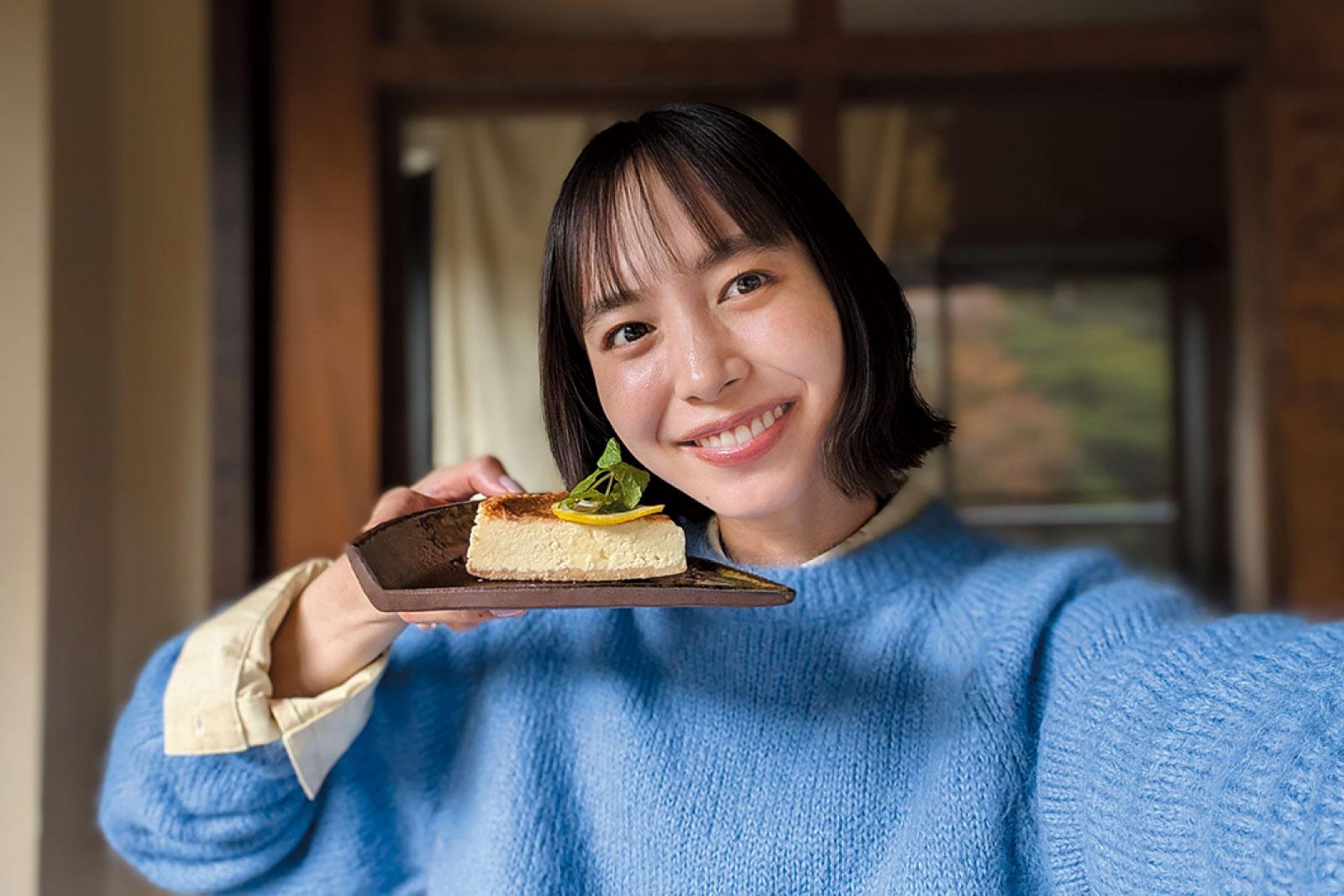 お店で人気の自家製ベイクドチーズケーキと自撮り。インカメを使っても、自分もケーキも鮮明。4200万画素の高精細レンズ搭載だから、プロ並みの写真に。オートフォーカスにも対応しているので、ブレにくいのも魅力