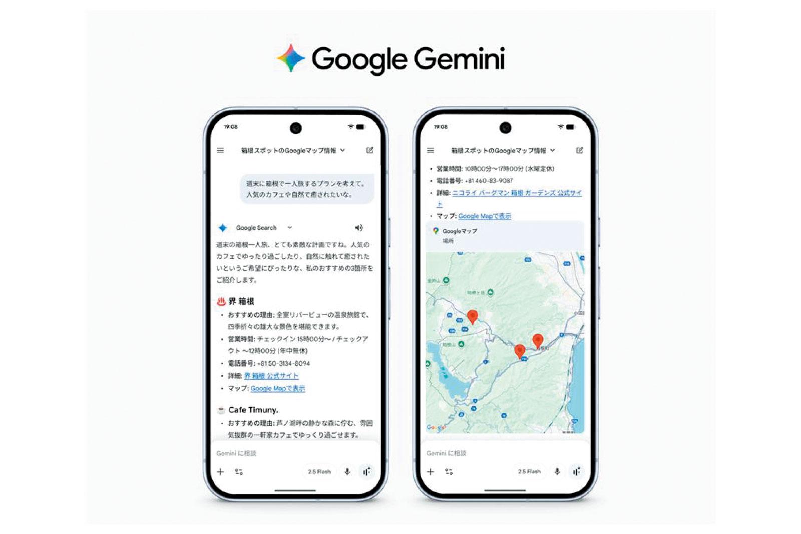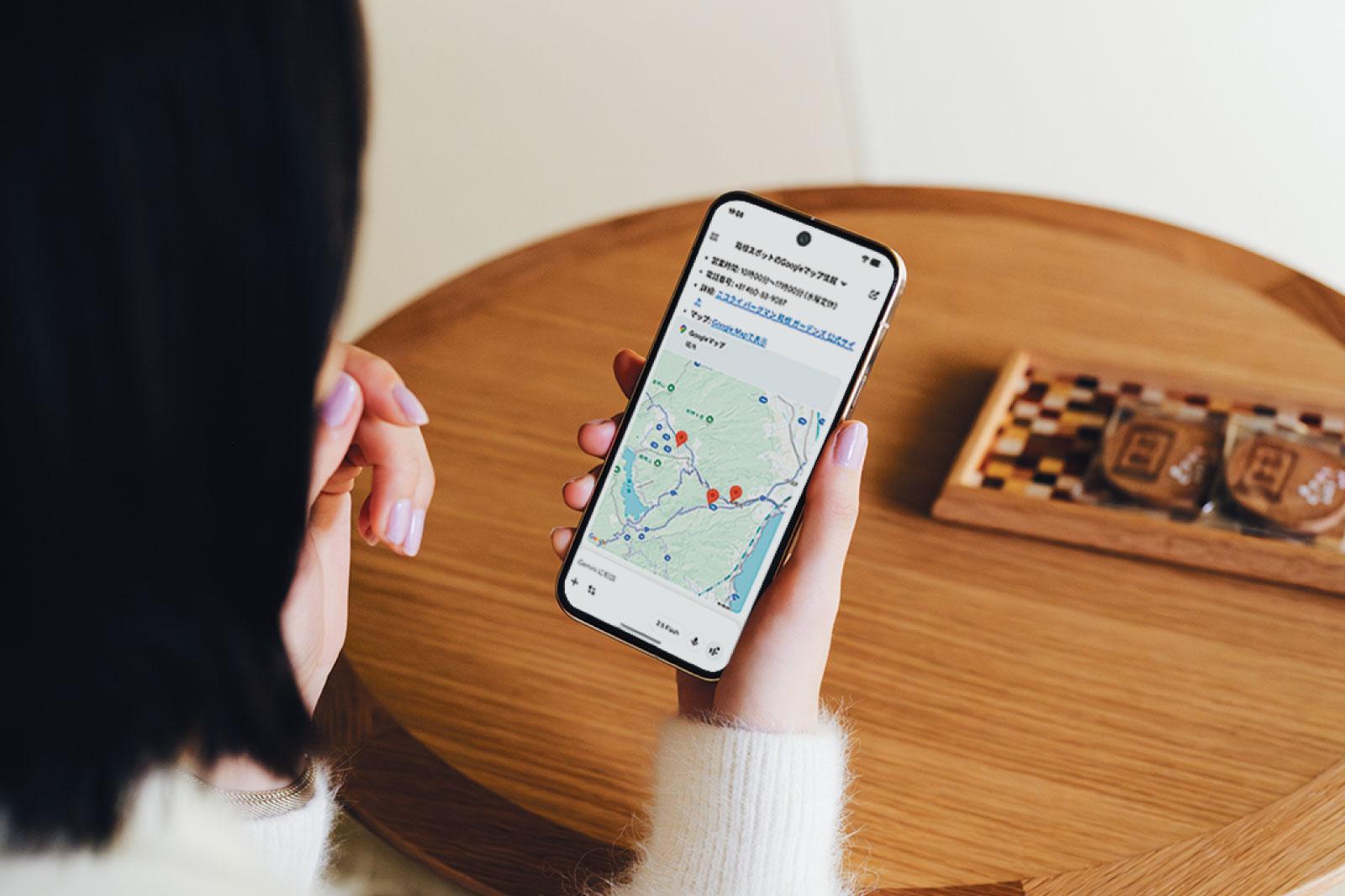 翌日の旅のプランはGoogle PixelのGeminiにお任せ/旅先でのプランに困ったとき、頼りになるのがGoogleのAIアシスタント・Gemini。電源ボタンを長押しする だけで起動できるからラクラク! アプリ連携でマップから直接Geminiに相談することで、移動手段や所要時間もすぐに把握できるから効率的に旅を楽しめる