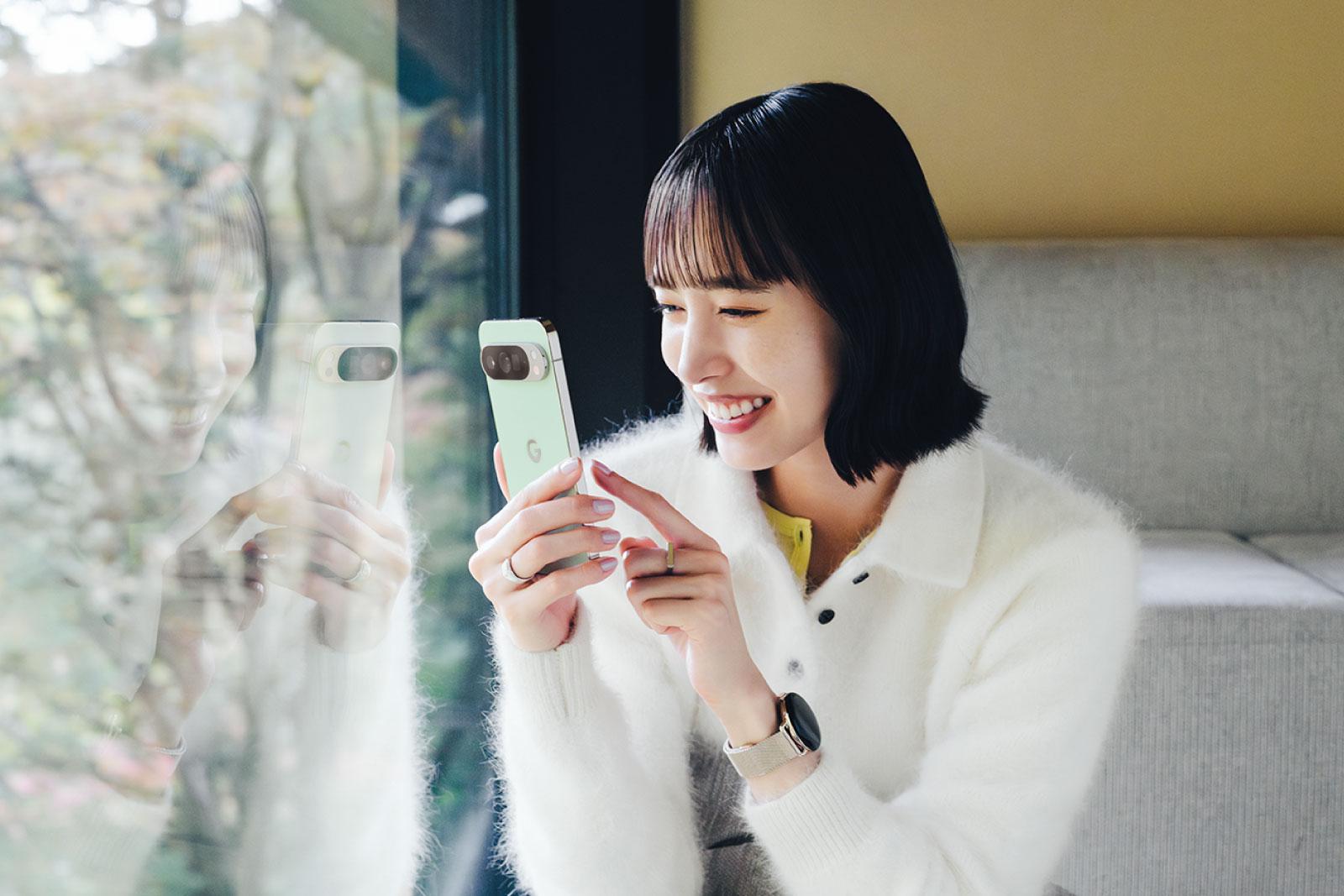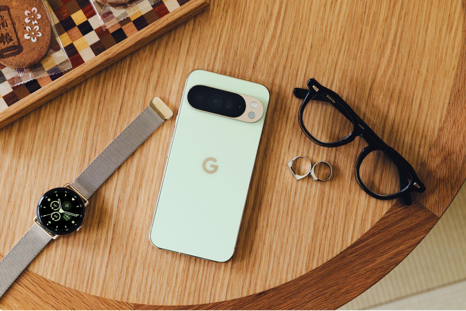 右・Google Pixel 10 Pro XL 。最先端のAIスマートフォンの新たなスタンダード。カラーは4色展開。翡翠を意味する、爽やかなJadeが今冬のイチオシ。¥192,900~ 左・Google Pixel Watch 4。シリーズ初の3Dドーム型ディスプレイを搭載。45mm ¥59,800~ 41mm ¥52,800~ Google Pixel Watch メタル メッシュバンド Champagne Gold 41mm ¥21,300