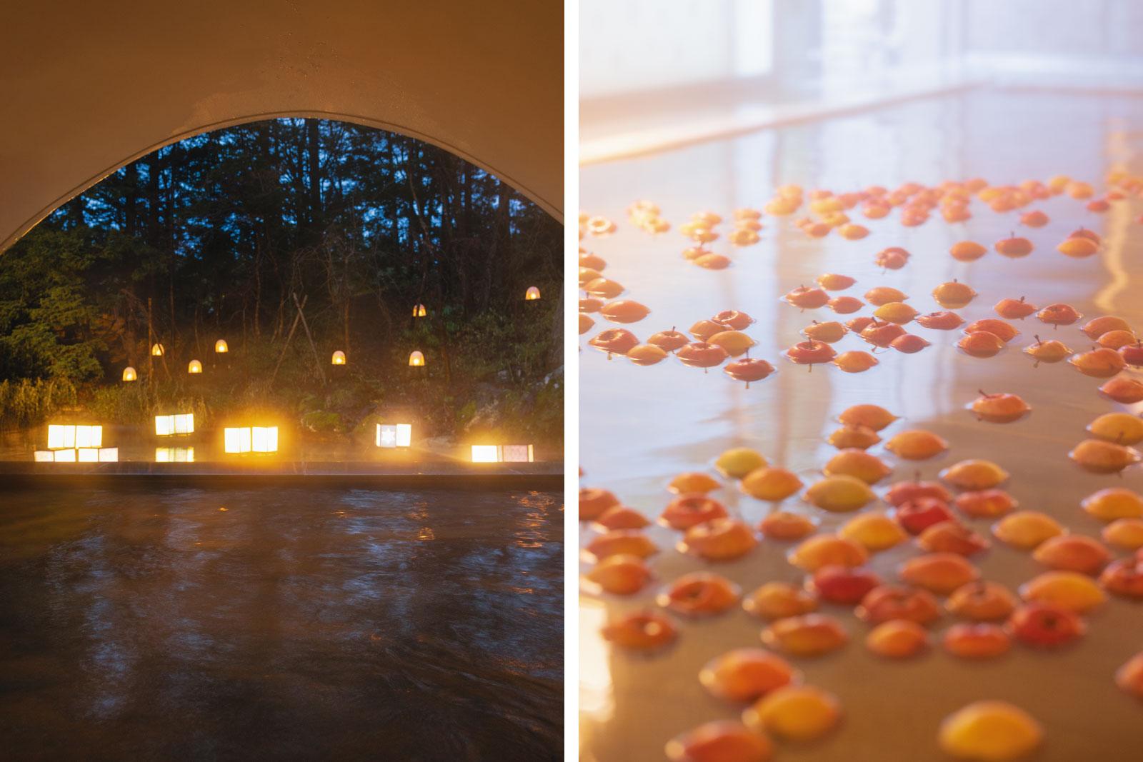 左/アーチ型の屋根に覆われた「かまくら露天風呂」は、かまくらの中で湯に浸かっている気分に、右/大きな青森ヒバの湯船に、たくさんのりんごが浮かぶ「りんご風呂」