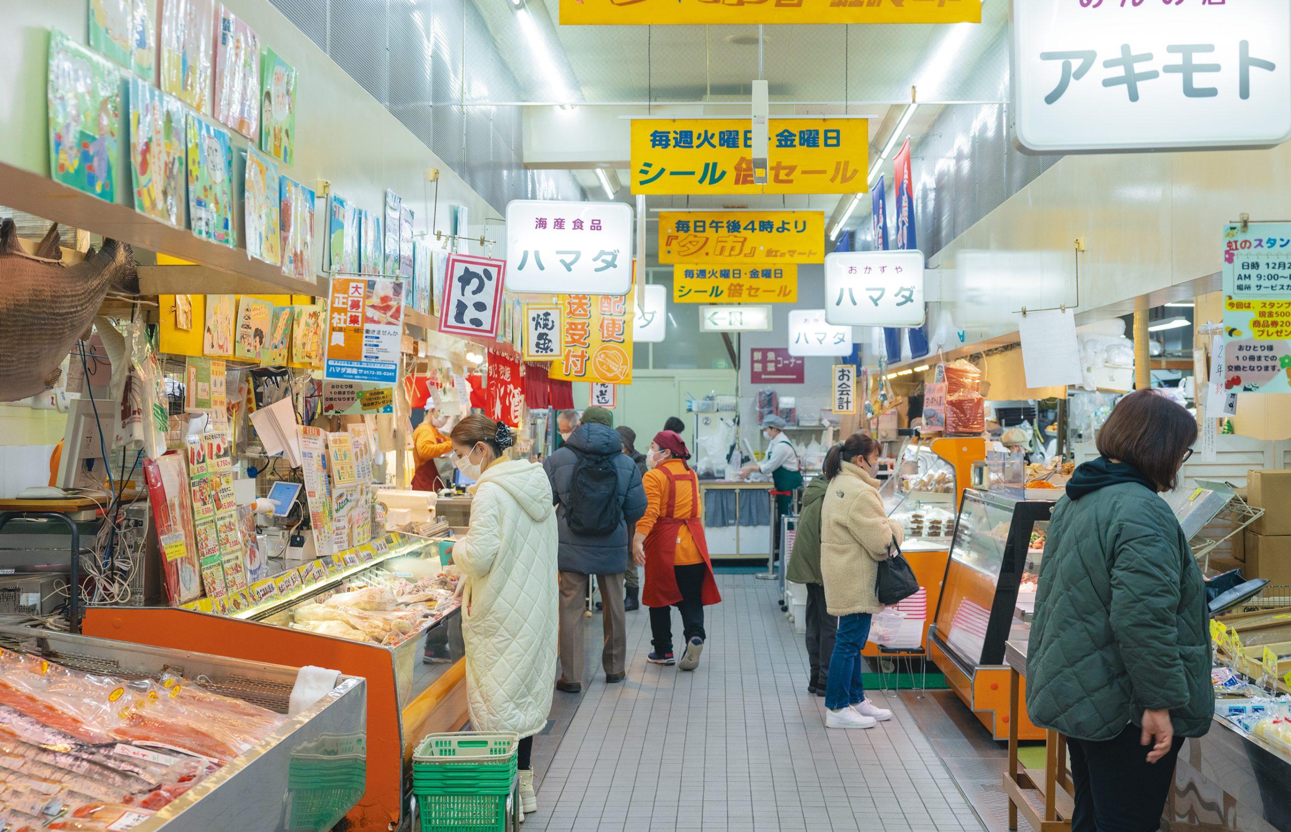 昭和の時代から市民の食を支えてきたこちらの市場。店内にはまぐろ、イカ、ホタテ、ヒラメ、すじこといった青森の魚介類や、とれたての野菜類、そして土地の食材を使った惣菜店など、多様な店舗が、そしてお客さんがぎっしり! 食に興味がある人ならば、何周しても飽きません。観光客におすすめなのが、市場内での朝ごはん。“いがめんち”や“弘前もやしの子和え”など土地の味をいろいろ買い揃え、イートインコーナーでいただくのがオツです。弘前市駅前町12-1/TEL. 0172-32-6411/8:00〜18:00/日曜休/https://www.nijinomart.com