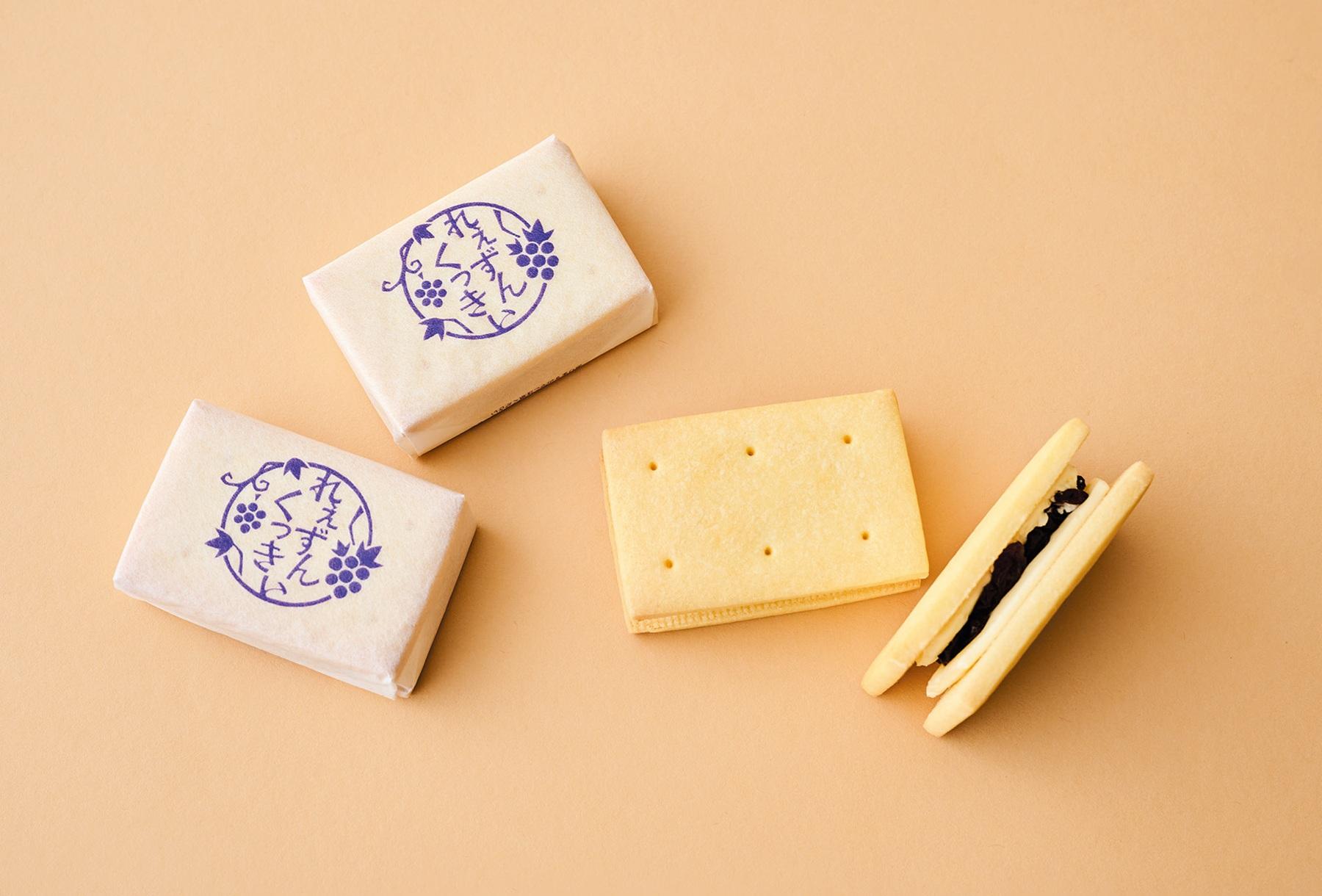 飾り文字の可愛らしい包みを開けると、バターの香りが広がる。昭和13年創業の和菓子店のれぇずんくっきいは、現店主の近藤智郷さんの父が昭和40年代に東京の菓子店で修業後、洋菓子の普及に伴い製作。作り方は今も変わらず、ほろほろくずれるクッキーとラムレーズンの酸味のバランスがたまらない。6個入り ¥1,720