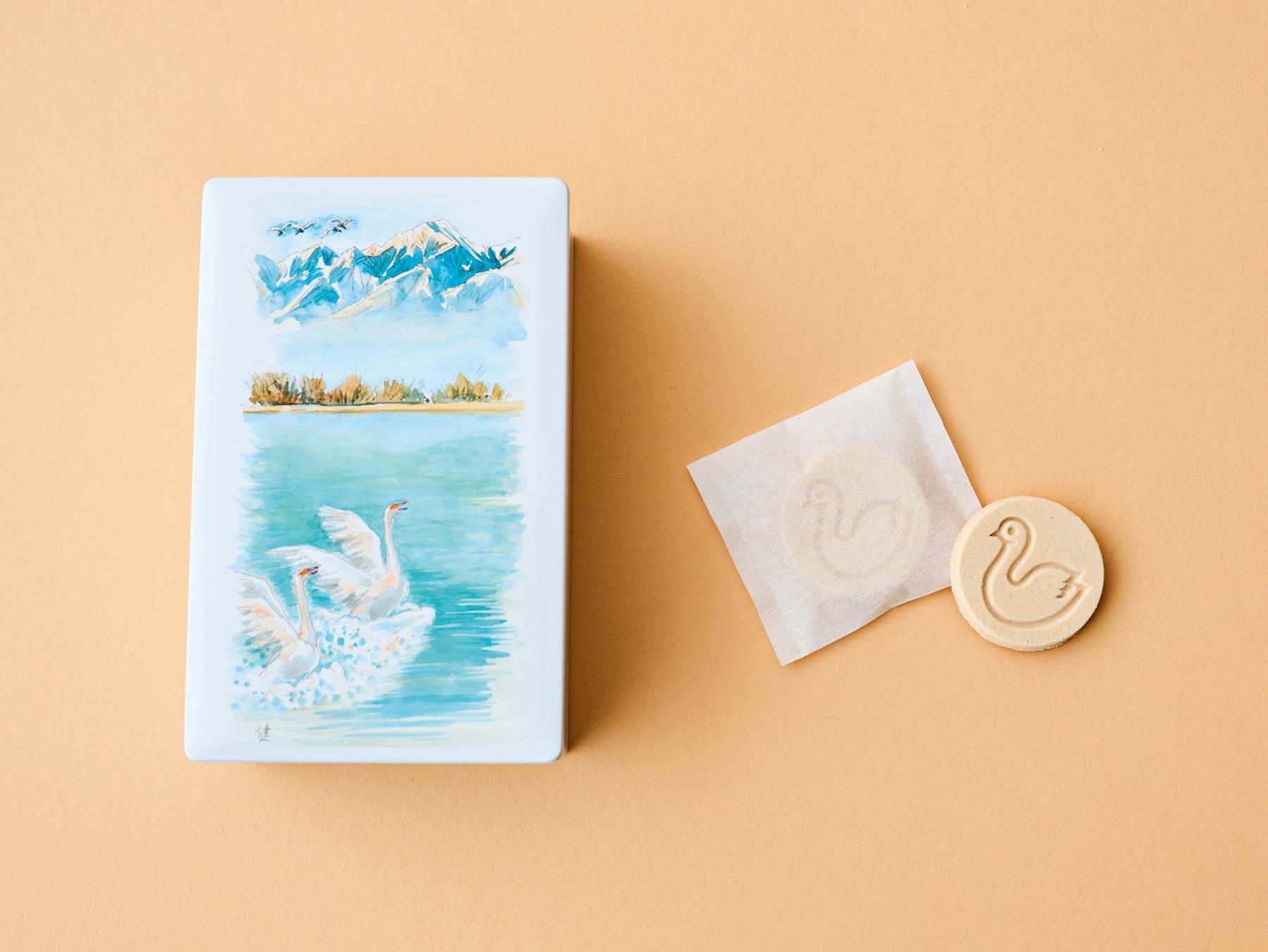 長野県安曇野市の犀川の白鳥がモチーフ。小袋を止めるアイコンシールにも注目。