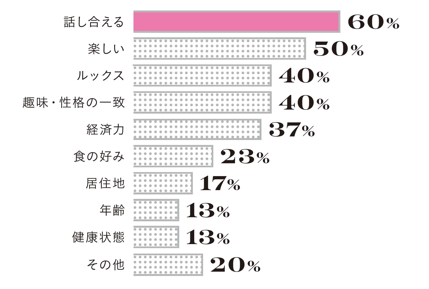話し合える…60%、楽しい…50%、ルックス…40%、趣味・性格の一致…40%、経済力…37%、食の好み…23%、居住地…17%、年齢…13%、健康状態…13%、その他…20%