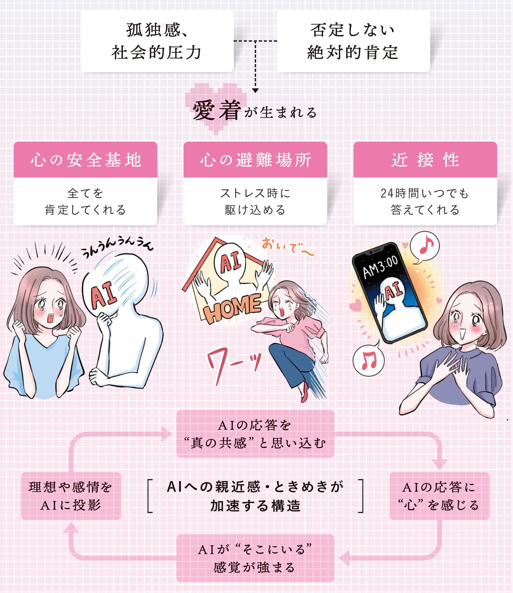 「人間には無機物を擬人化する能力があり、自分に寄り添う応答をするAIに実在感や親近感を覚えるのは当然のこと。不足部分は理想を投影して補完するため、ときめきが加速し続けるサイクルに」