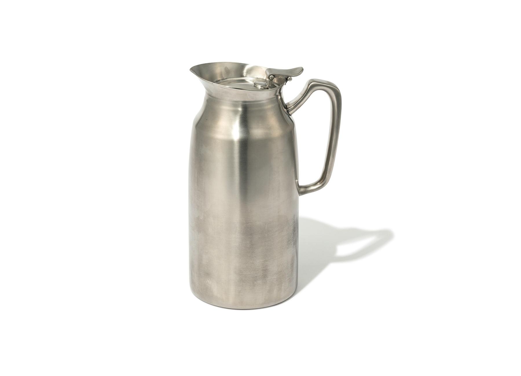 90°Cのお湯が1時間経過しても約80°Cをキープする、高い保温力が特徴。蓋を上げると中栓も一緒に外れる一体型構造もポイント。ステンレス二重ポット つや消し 750cc ¥34,650(和田助製作所/LOST AND FOUND TEL. 03-5454-8925)