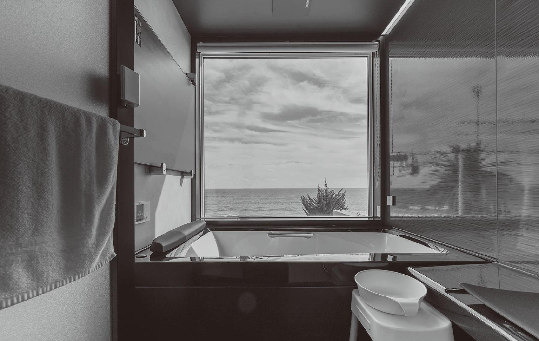 部原海岸1分のロケーションに昨年11月オープンした「HOTEL R9 The Yard 勝浦」には、シリーズ初のメゾネットルームが誕生。こちらは黒ではなく青色のコンテナが特徴。コンテナを重ねた2階建ての客室で、1階にリビング・ダイニング、2階にベッドルームを配した2層構造。最大4名まで泊まれるため観光客の利用も多く、いずれの客室も海側に面しており、窓からは海とサンセットビューが楽しめる! また海を望む広々とした浴槽も完備し、穏やかな時間が過ごせる。