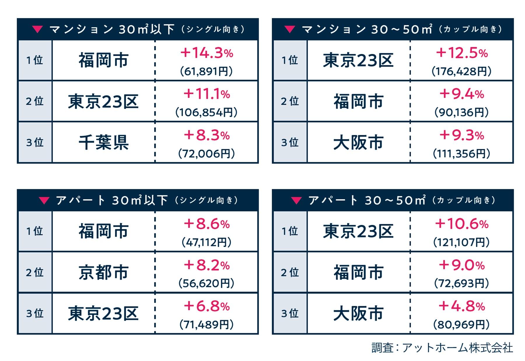 首都圏(東京23区、東京都下、神奈川県、埼玉県、千葉県)、札幌市、仙台市、名古屋市、京都市、大阪市、神戸市、広島市、福岡市のうち10エリアで前年の同月を上回る結果に。シングル向きでは東京23区が19か月連続、大阪市が17か月連続で最高値を更新、東京23区は6か月連続して全面積帯で最高値を更新するなど、値上がりが顕著に。