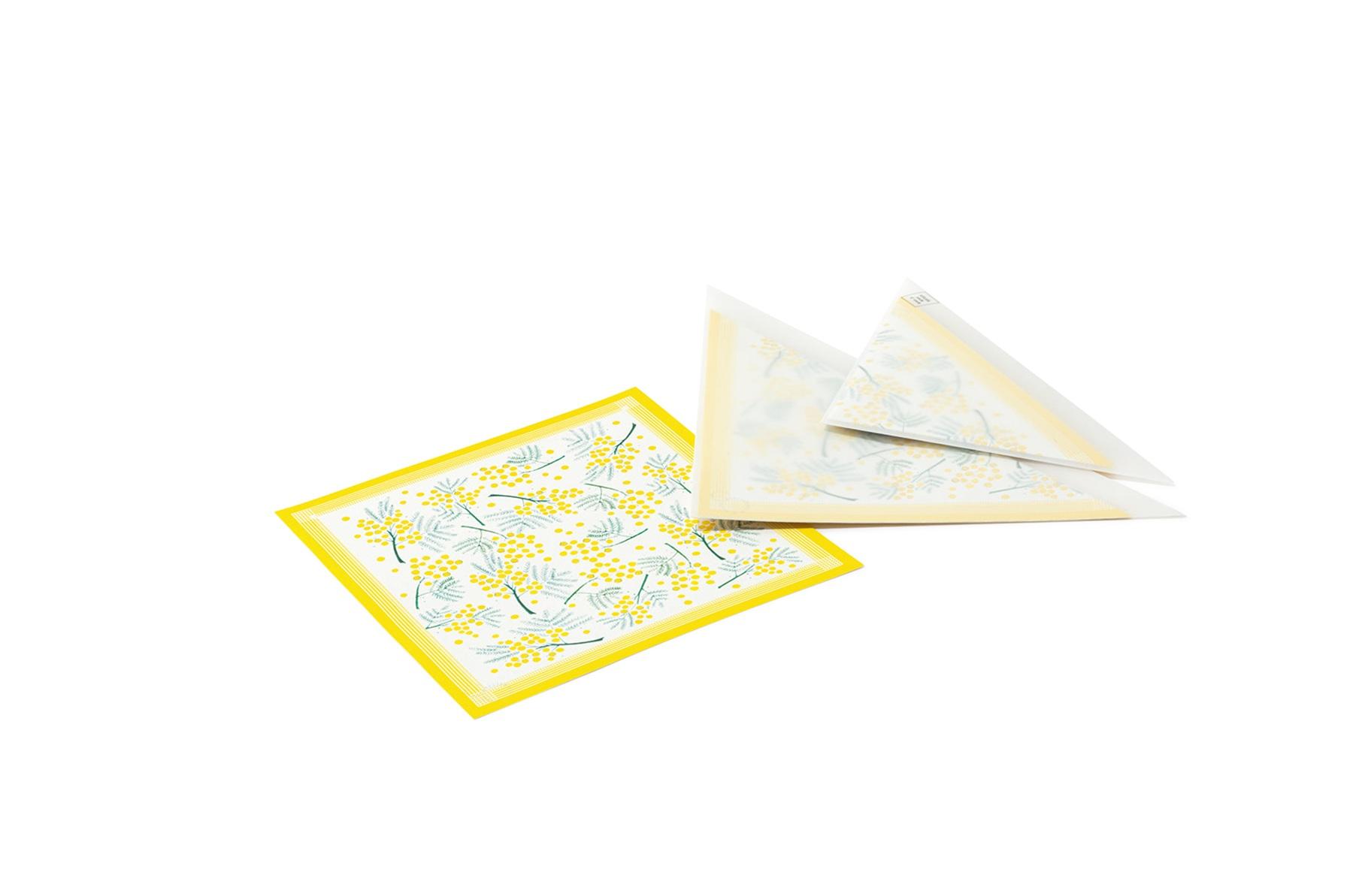 透ける三角封筒と正方形の便箋のレターセット。まるでハンカチのようなデザインで、便箋を広げるとパッと華やかな柄が見えるのが可愛らしい。封筒大・小各2枚、便箋6枚入り ¥770(ATELIER. encle d'encle encledencle@leto.eonet.ne.jp)