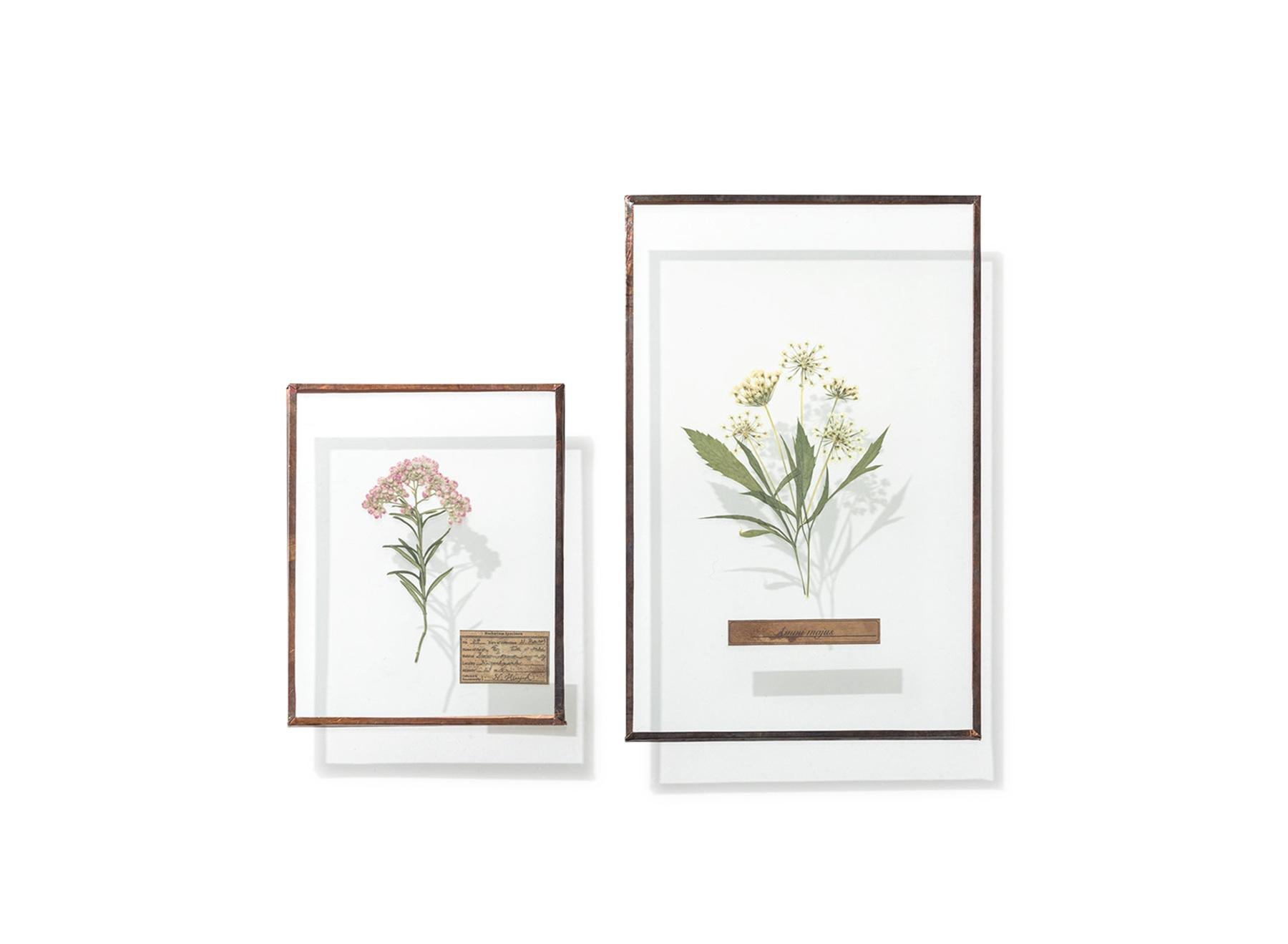 草花が見せる一瞬の美しさをガラスに閉じこめた一品。自然の中で生まれたものだから、同じ種類の花でもひとつずつ印象が異なるのが面白い。大10×15.8×0.5cm、小8×10cm 各¥3,850(はいいろオオカミ+花屋 西別府商店 TEL. 03-3478-5073)