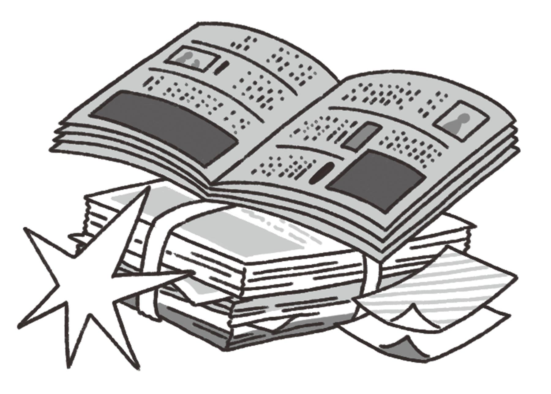 濡れた紙は乾かしてから、粘着テープは剥がしてから、できるだけ種類ごとに正しく分別。油や食品の汚れがある古紙は可燃ゴミへ。シュレッダーくずは、散らばらないようにしっかりと袋をしばること。公共施設やスーパーなどに設置された回収ボックスを利用するのもあり。