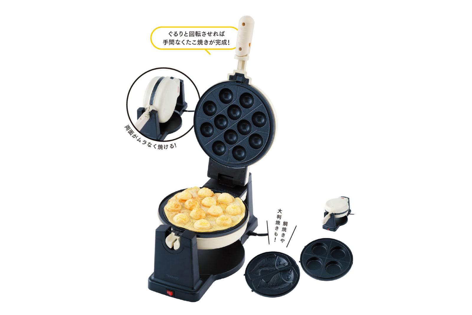 タコパは楽しいけれど、つきっきりでの作業は大変…という人にぴったりな、回転機能付き屋台焼き機。生地や具材を入れたら蓋を閉じ、本体ごと回転させることで手間なく完成。「通常のたこ焼き器は下から加熱するだけですが、両側から加熱し回転させながら焼くことで素早く大量に焼けるようにしたアイデアがすごい。プレートを替えれば、鯛焼きや大判焼きも楽しめます」(松橋さん)。 ¥12,800(サンコー通販部 TEL. 03-3526-4326)