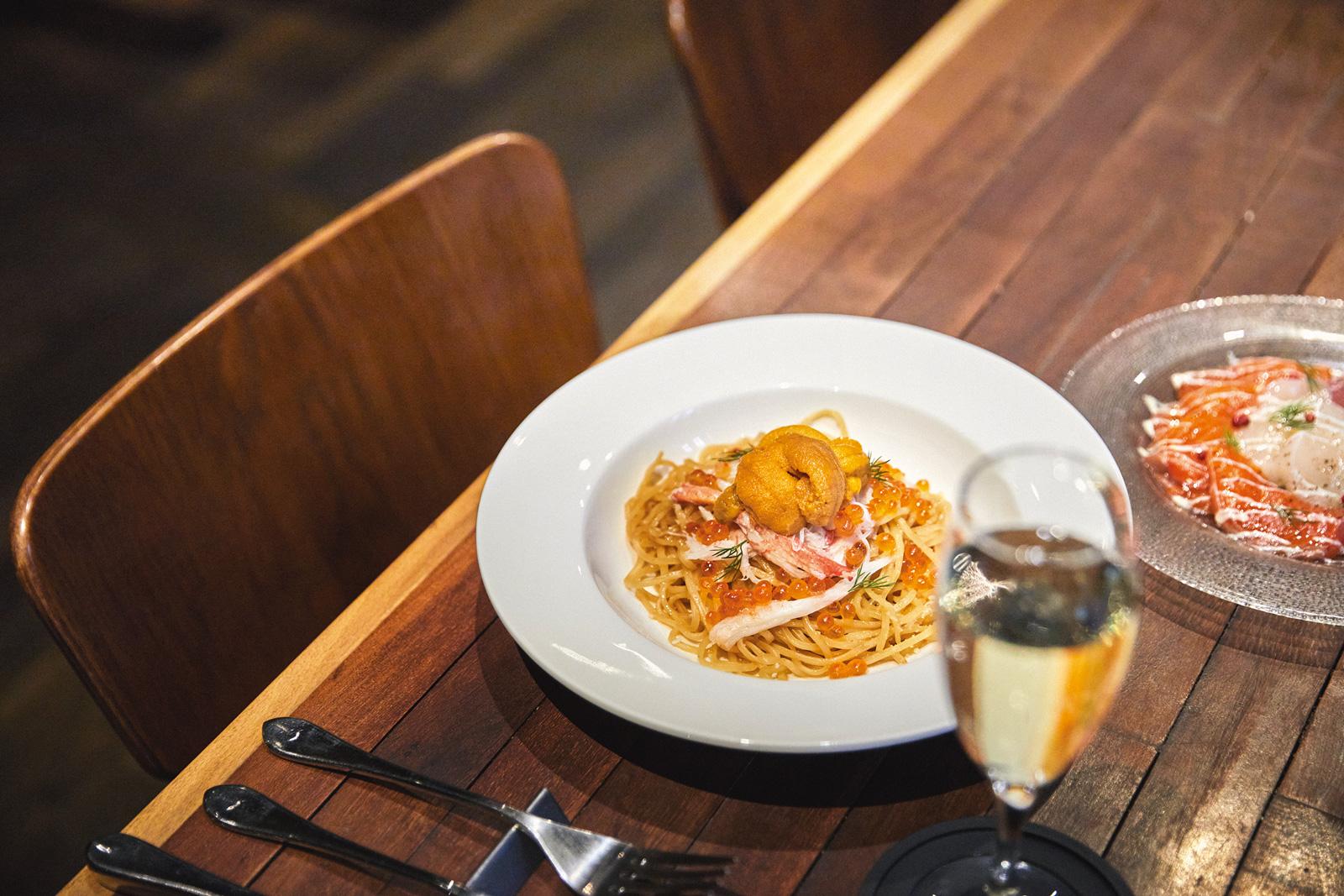 港町海鮮パスタ 生ウニ&ズワイ蟹&イクラ¥5,600〜 本日の鮮魚カルパッチョ3種盛り¥2,000