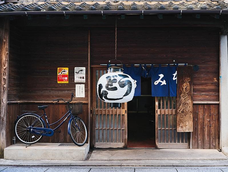 大正時代に建てられた風情ある木造の建物と、店先の大きな提灯が目を引く。暖簾をくぐると、黒光りした椅子にテーブルが並び、昔ながらの風情を感じさせる。この地で70年以上続く店は、厨房の大きな茹で釜であらかじめ茹でてある麺をあたためるのも、釜であたためておいた徳利に入った出汁をかけて提供するスタイルも、昔ながら。ふんわり食感のやわやわ麺は、カツオや昆布、鯖節などでとった出汁をまとった優しい味わい。すべて¥100でトッピングが選べるのも嬉しい。