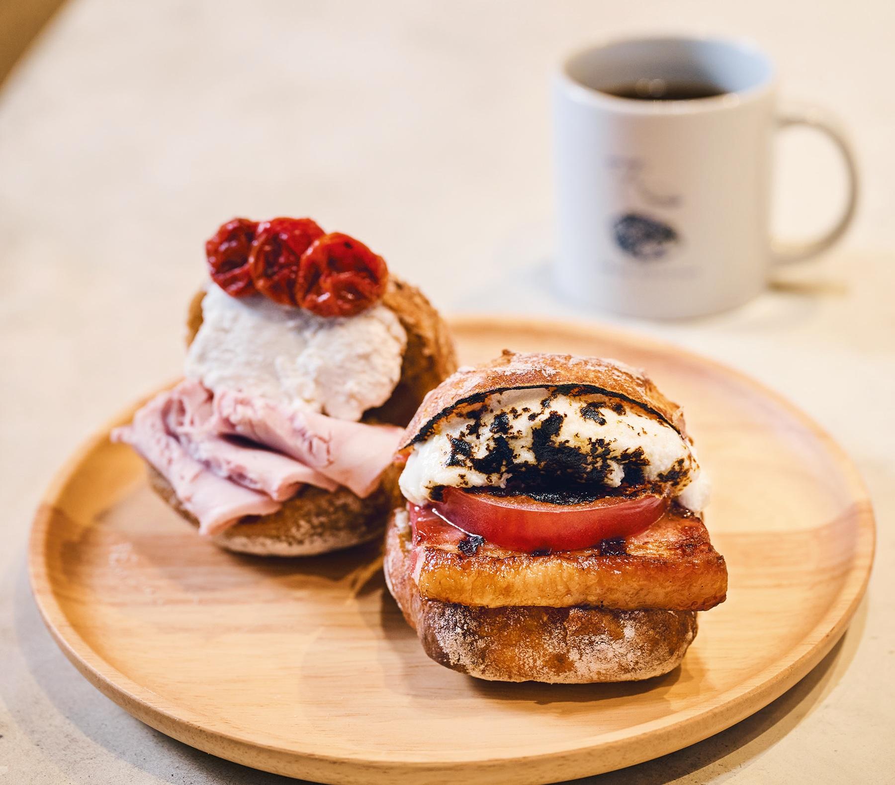 手前から、厚切りベーコングラタン¥454、自家製ハムとリコッタチーズのサンド¥572、ホットコーヒー¥500。ドリンクをオーダーすると、店内でイートインが可能。