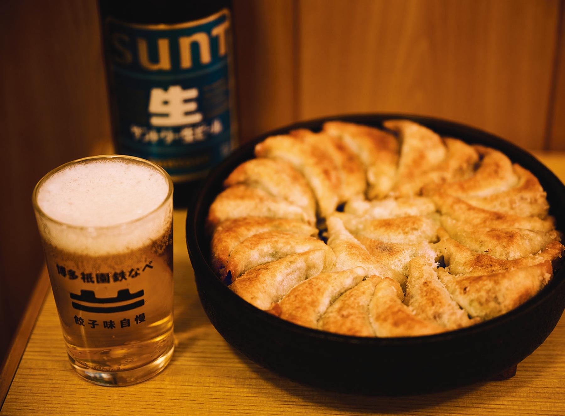 鉄なべ餃子1人前(8個) ¥570。写真は3人前。瓶ビール ¥580。辛子明太子など、餃子の焼き上がりを待つ間に楽しめる、おつまみ系の一品料理もある。