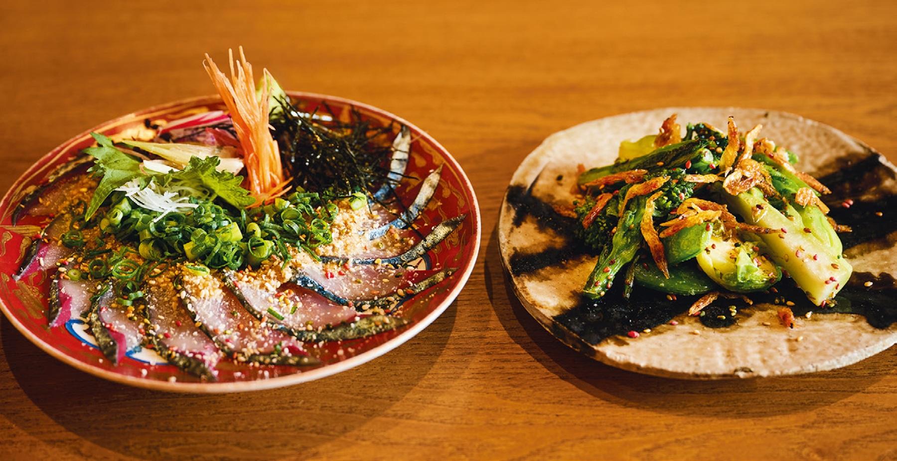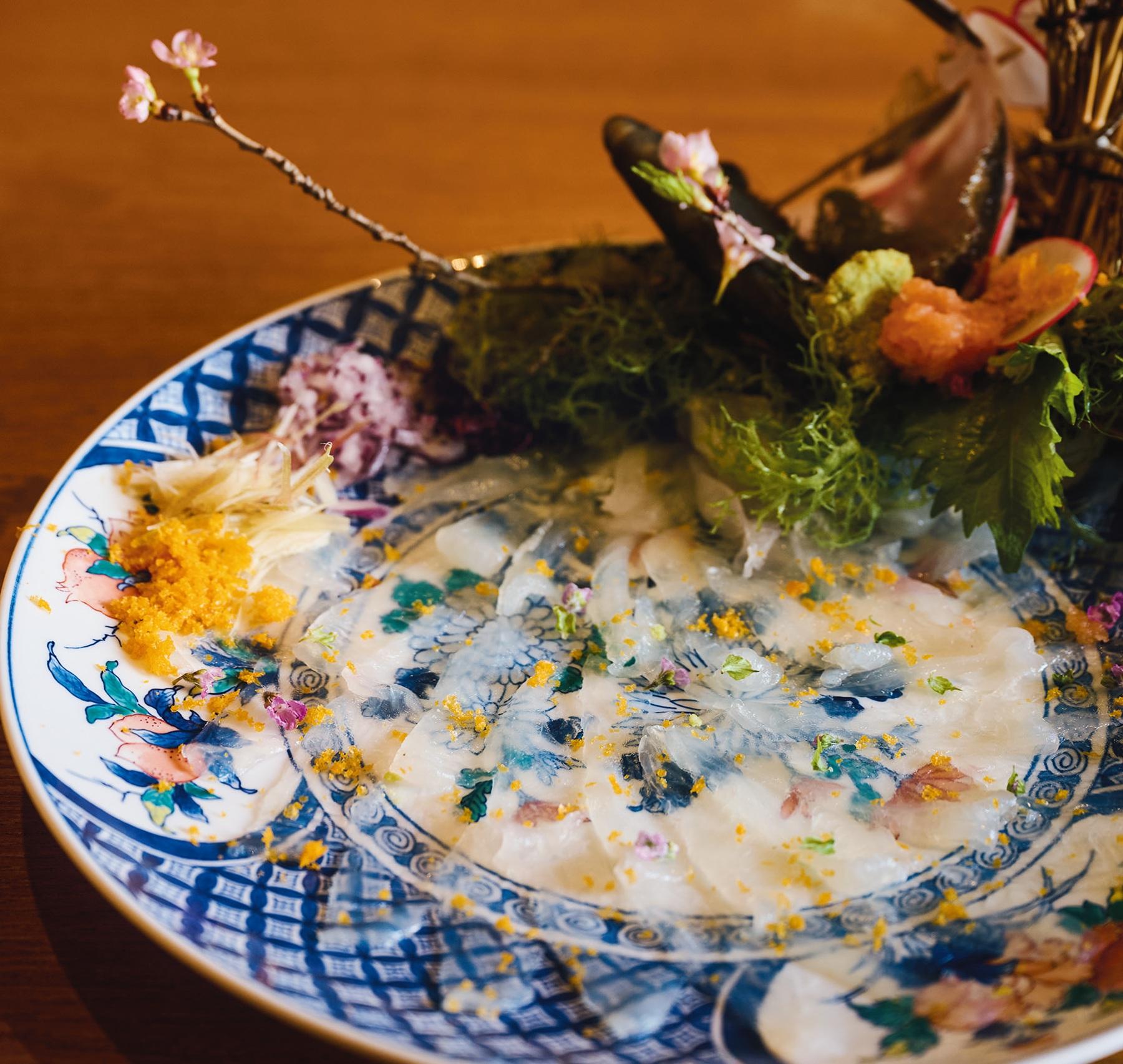 1階カウンター内に生け簀があり、そこで泳ぐ魚を注文を受けてから捌いて提供する生簀料理が人気。写真のかわはぎの姿造りも、肝を溶いた醤油で食べられるのは、その鮮度ゆえだ。魚介以外にも、地元で獲れた旬の食材を使った料理が多数揃う。京料理の名店や福岡の有名料亭で修業したオーナーが手がける店だけに、ひと手間かけたメニューが多く、器や盛り付けにも技あり。