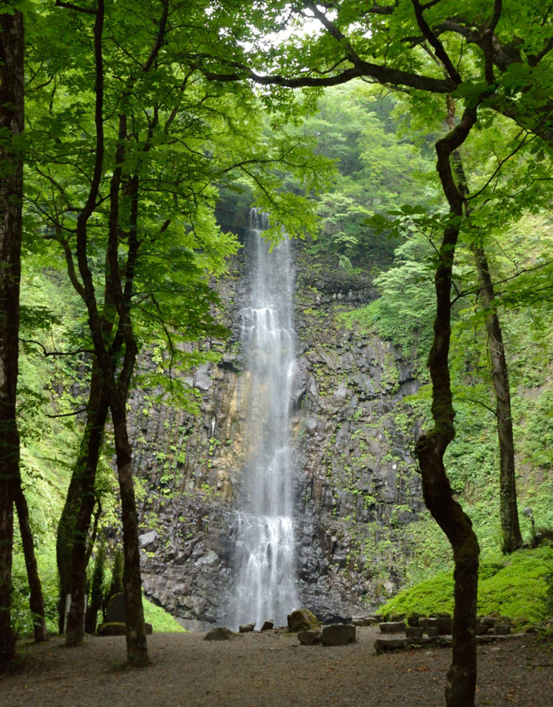 「約1200年前に弘法大師が神のお告げにより見つけ、命名したという逸話があります。水が真っすぐに落ちる“直瀑”といわれる滝で、力強い。冬には流れ落ちる水が凍り、氷瀑となることも」