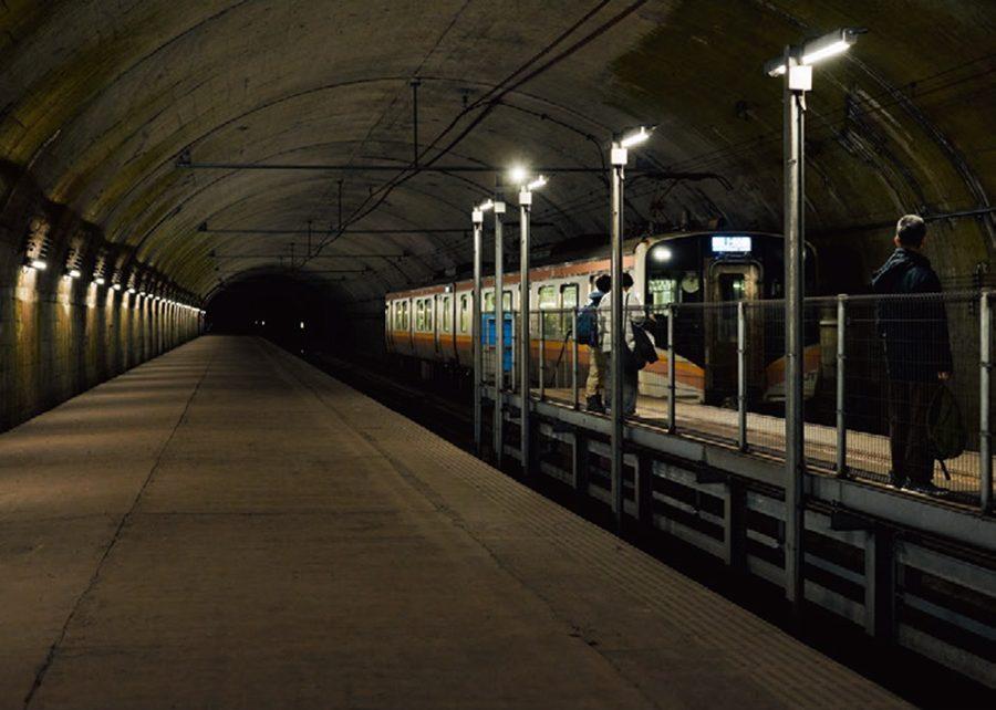 先ほどまでの銀世界はいずこ、突如現れる気が遠くなる階段は、338m、462段。ゲーム世界か、はたまたSFか。“モグラ駅”の名を納得せざるを得ない重厚感に包まれ、電車が近づくにつれ、ゴゴゴ…と風と機械音が鳴り響く。