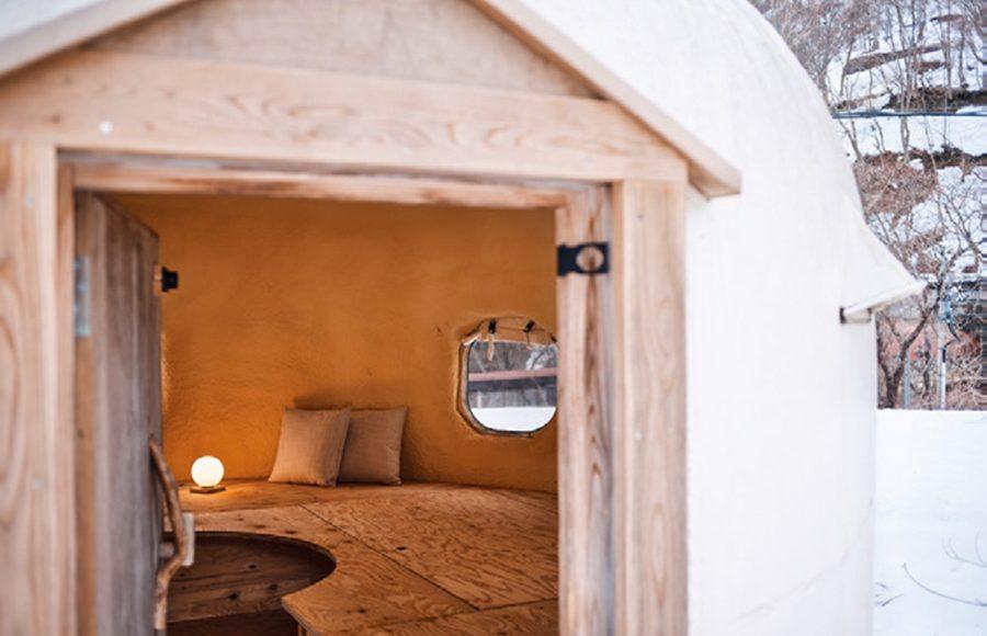 宿は駅直結なので移動も楽チン。GUEST ONLYの扉を開けてデッキを進むと、なんとも可愛いメレンゲのようなインスタントハウスが顔を出す。こう見えて実は災害地での仮設住宅用に開発された優れもので、中はほっかほか。