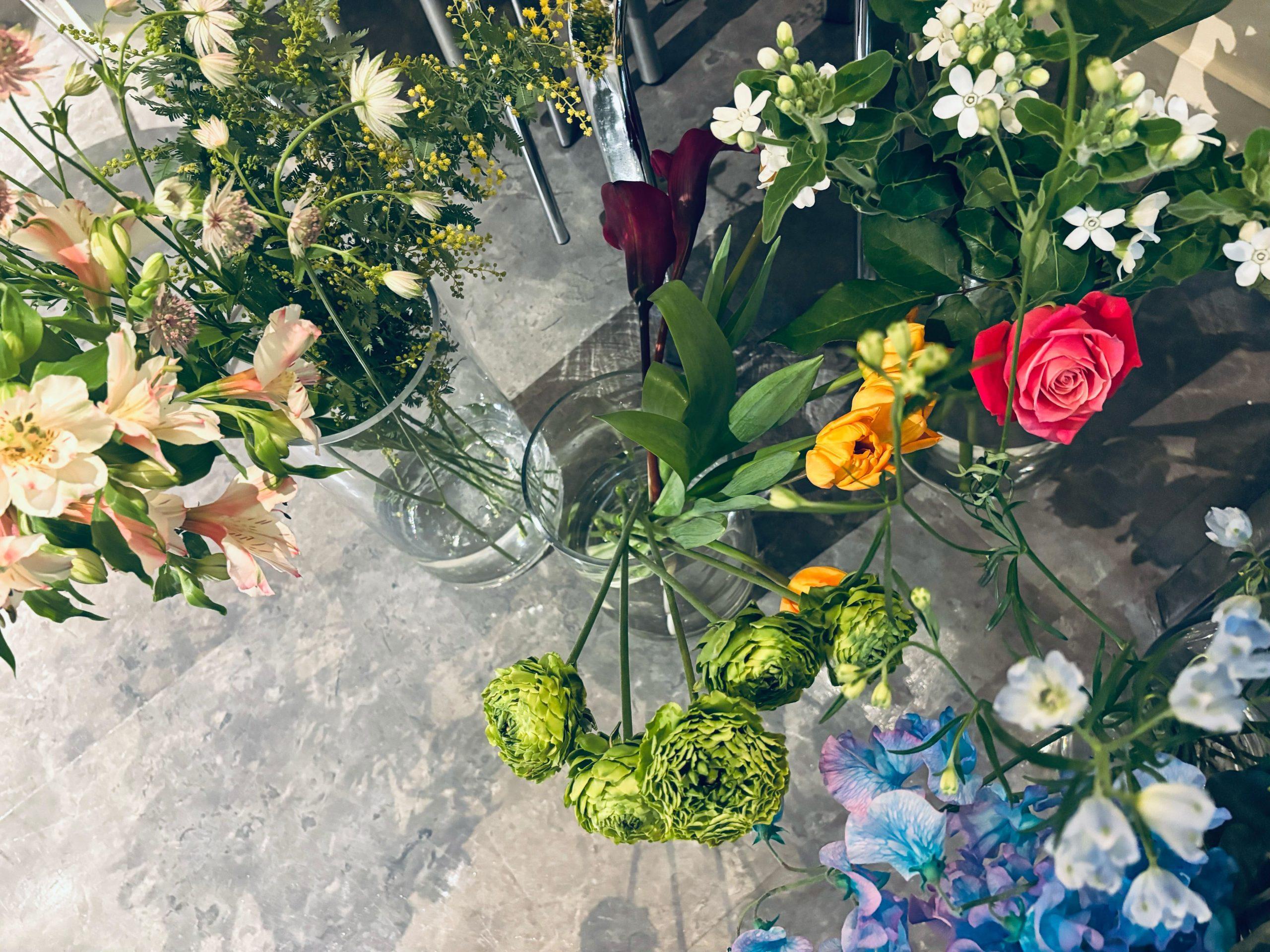フラワースタイリストさんに、佐野さんのメンバーカラー・緑が映える素敵な色味のお花をご用意いただきました!