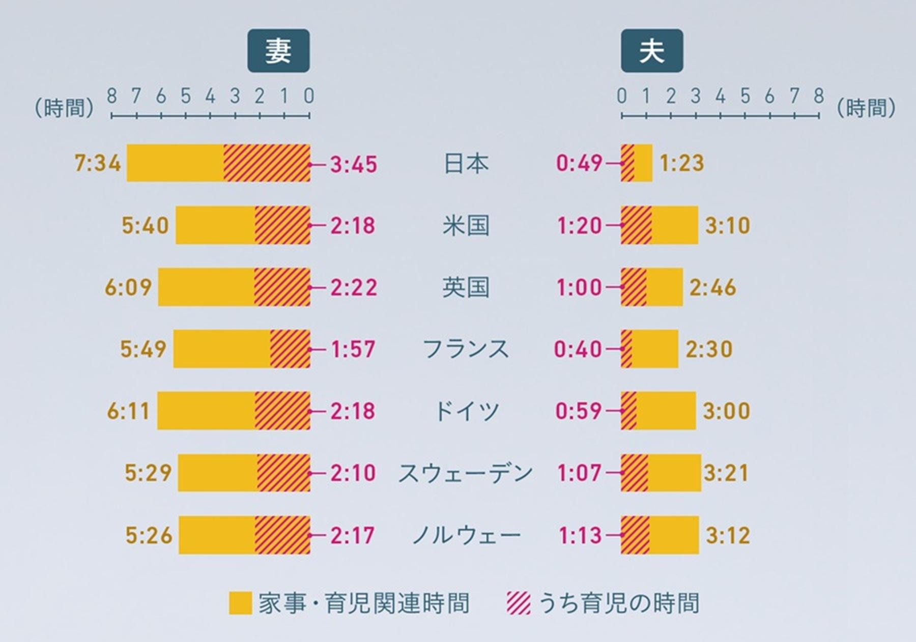 6歳未満の子どもを持つ夫婦の家事・育児関連時間(1日あたり)/日本は夫が家事・育児に費やす時間が1時間23分。妻の7時間34分とは、大きな差がある。しかも、育児は49分とわずか。他の先進国と比べても、日本は夫が費やす時間が格段に少ない。出典:内閣府 男女共同参画局『男女共同参画白書 平成30年版』